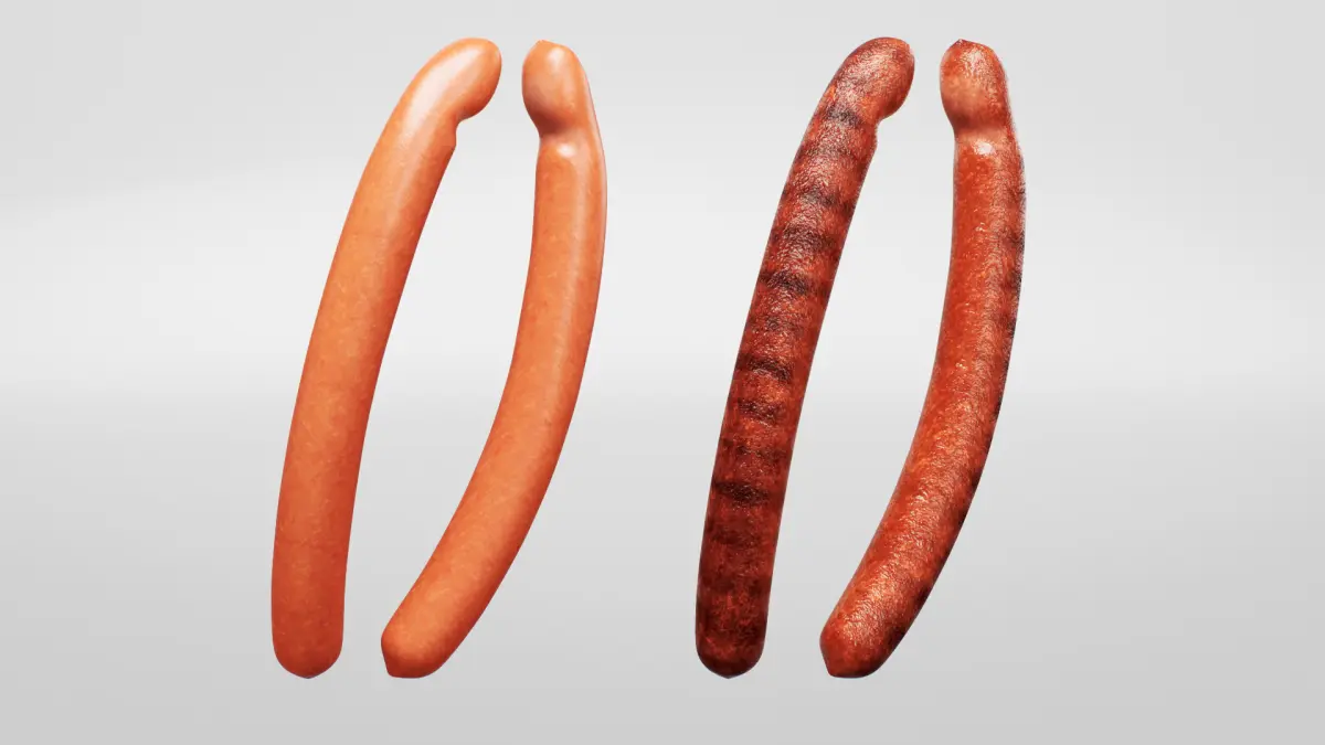 Highly realistic 3D models of sausages in transparent film wrap, featuring detailed packaging, one grilled sausage, and two raw variations. The sausage appearance can be art-directed by adjusting subsurface scattering radius for precise material control. The label is fully customizable and can be replaced with your own product branding.