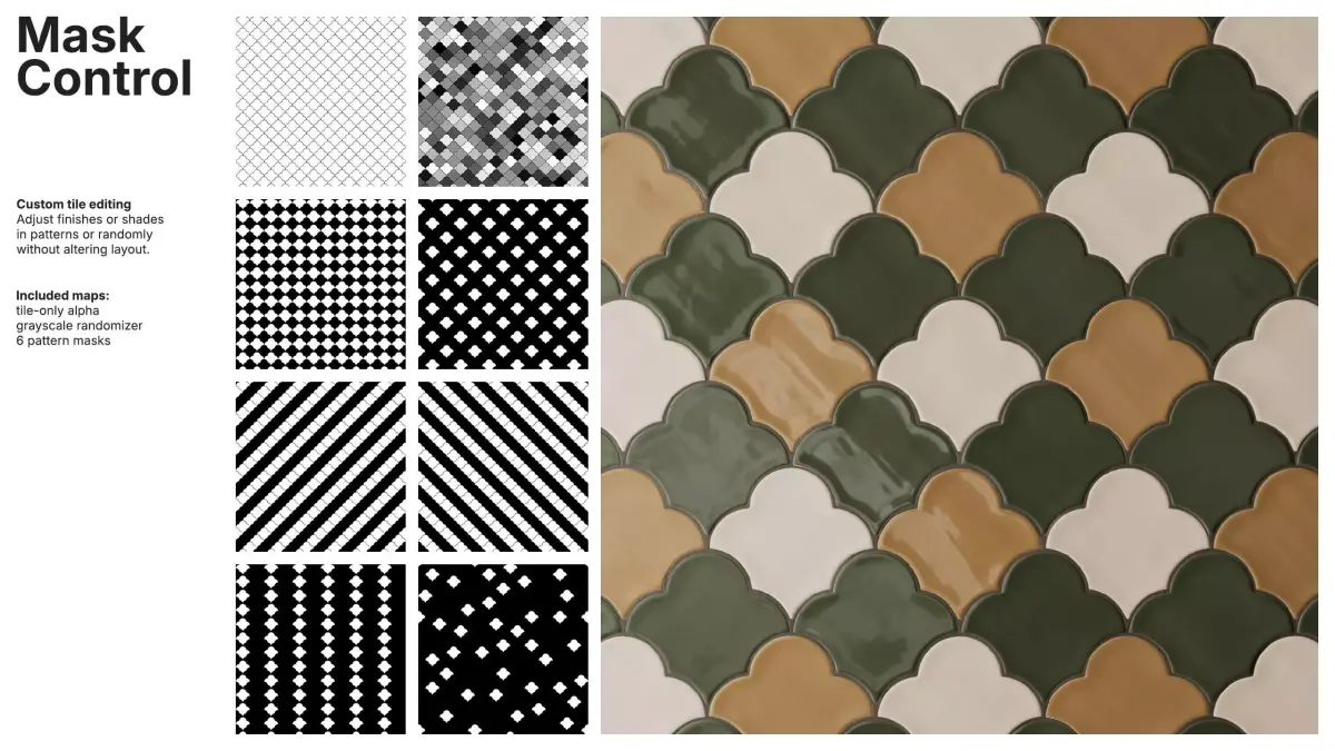 Pattern and random masks allow independent control of tile and grout colors, enabling global, per-pattern or per-tile adjustments without disturbing the layout. Tile-only alpha, a grayscale randomizer and pattern masks ensure full customization for complex designs.