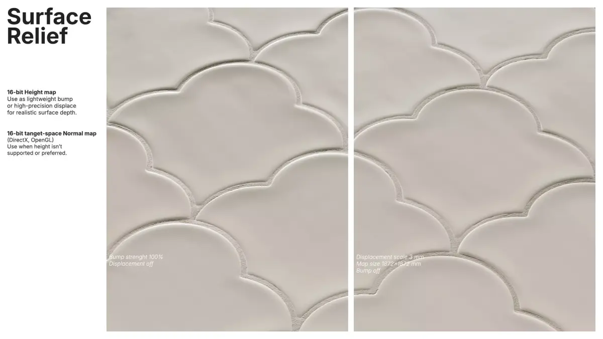 Surface relief is provided by a RAW 16-bit height map tuned for a true 3 mm depth (1872x1872 mm surface), suitable for lightweight bump or precise displacement. A 16-bit tangent-space normal map (DirectX/OpenGL) is included for cases where height-based workflows aren’t preferred.
