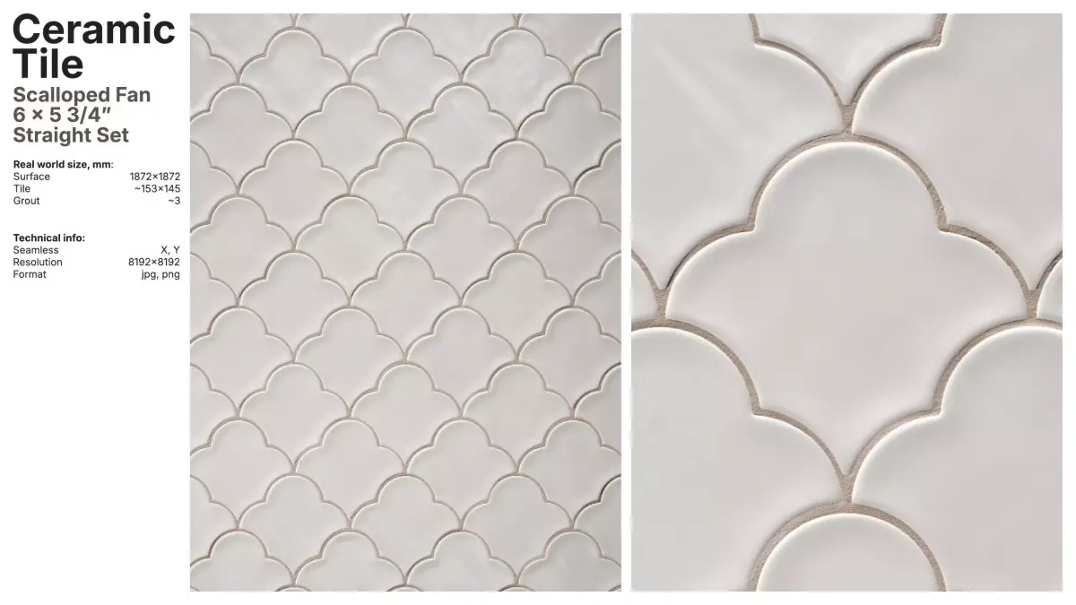 Glazed artisan ceramic tile material in a scalloped fan 6 x 5 3/4" format arranged in a straight set layout.