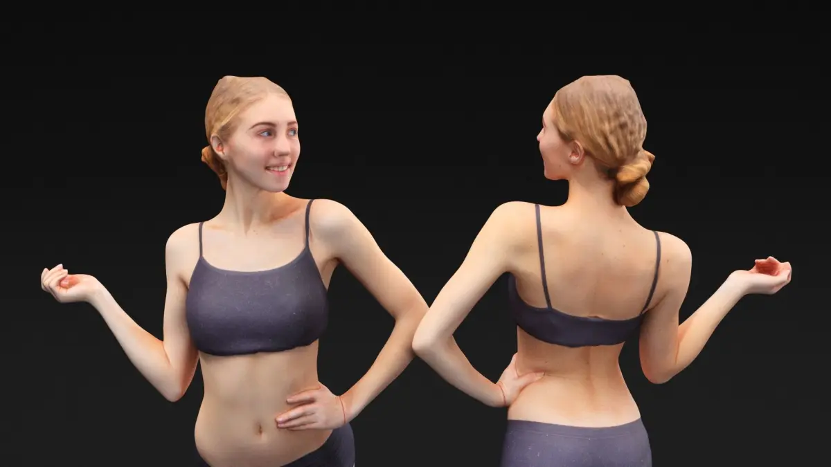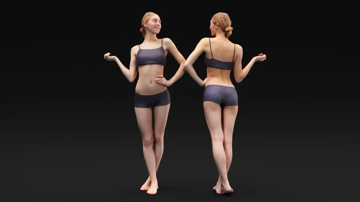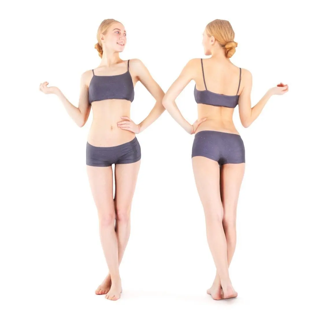 This is a true human size and detailed model of a sporty beautiful young woman of Caucasian appearance. The model is captured in casual pose to be perfectly matching for variety of architectural visualizations, e.g. sport ground, gym, beach, etc.