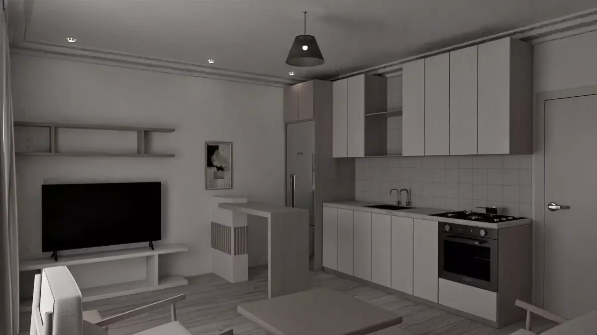 This product is a fully modeled and rendered realistic 1+1 apartment interior, designed with real-world architectural proportions and a functional residential layout. Includes both 3D visualization scene and a dimensioned AutoCAD floor plan in PDF format.The apartment is planned as a compact yet comfortable living unit, featuring a clear circulation axis and well-balanced room proportions. All spaces are modeled based on architectural standards, not just visual composition.
