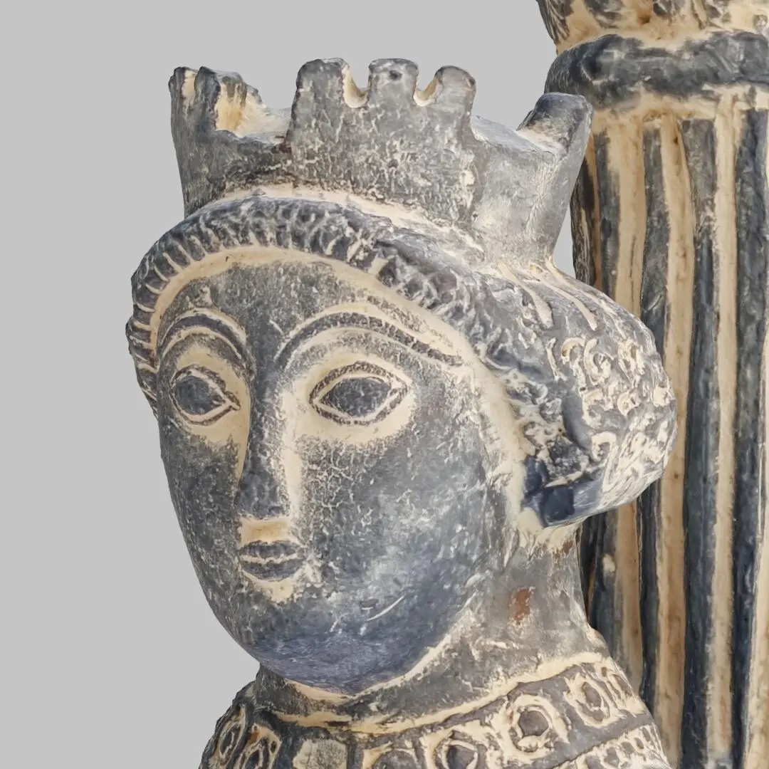 This is a high-quality 3D scanned model of an ancient female statue bust, featuring intricate details and realistic textures. The sculpture represents a crowned female figure, adorned with elaborate jewelry and traditional attire, showcasing the artistic style of ancient persian cultures. Attached to the figure is a fluted cup with palm leaf capitals, adding architectural context and historical richness to the piece.