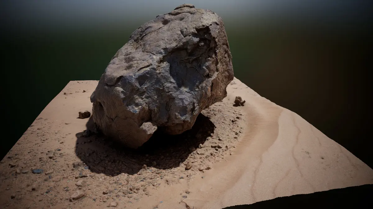 Hi-res photoscan of a rock and another smaller one on dry pressed sand area. Model comes with 16387x16384 diffuse and AO map.