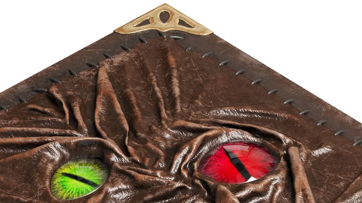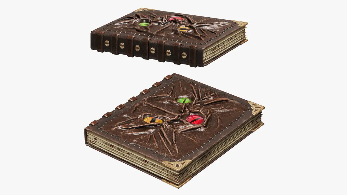 An antique book in a leather cover, decorated with metal corners and rivets. On the cover: imitation of dragon eyes made of glass, patch. Pages: aged, decorated with blood streaks.