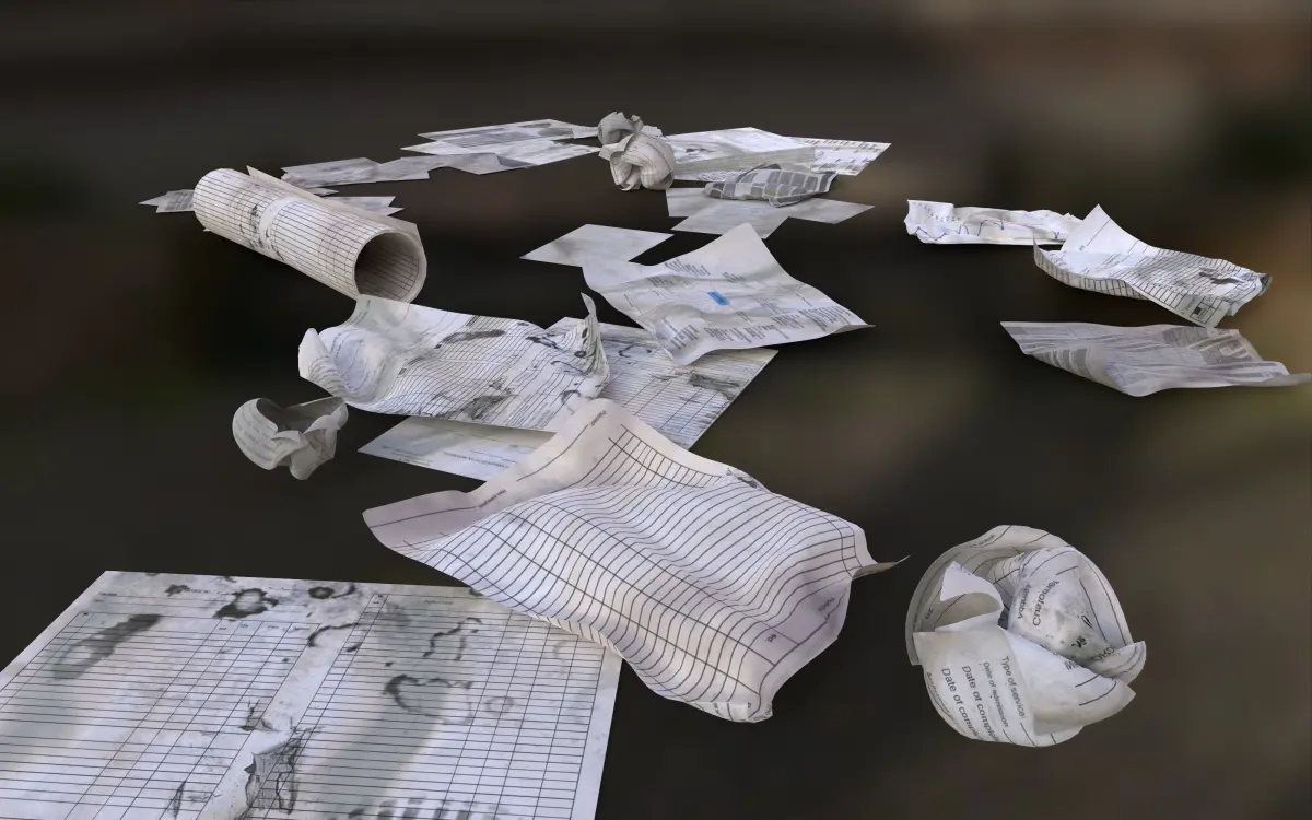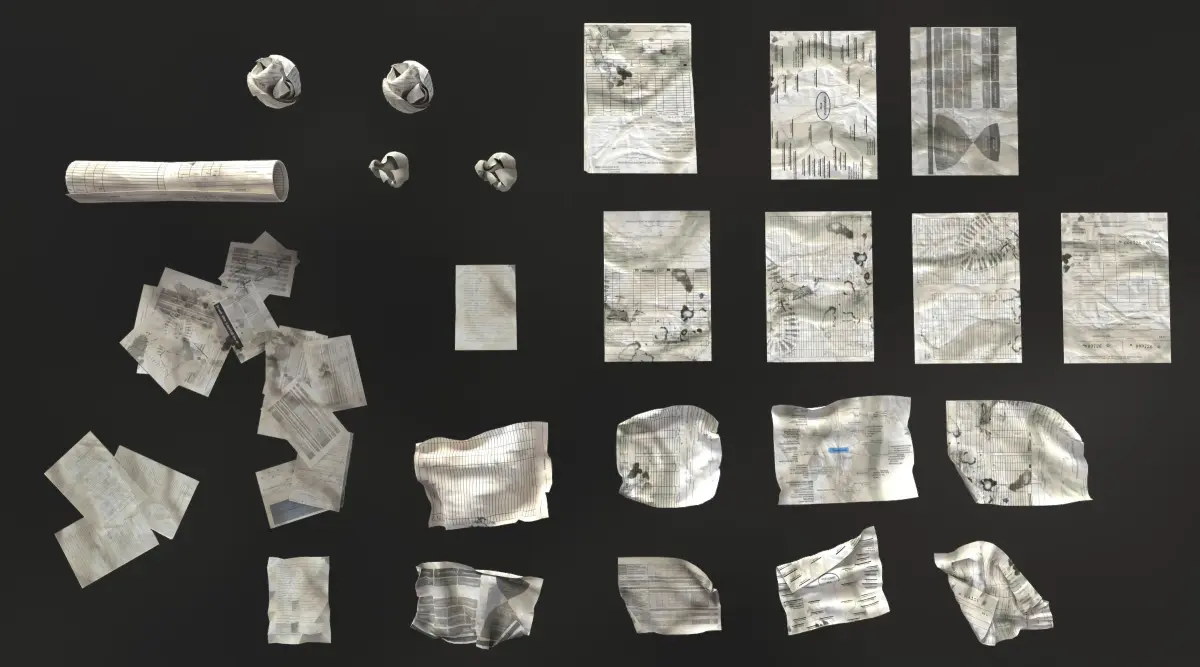 Scattered and crumpled papers to create a special mood in the scene. Clean and dirty versions..FBX files.Scattered and crumpled papers are suitable for a modern realism or post-apocalyptic scene.The scene contains two types of assets: one-sided and two-sided. Choose the one you need depending on what shader you use in your project.