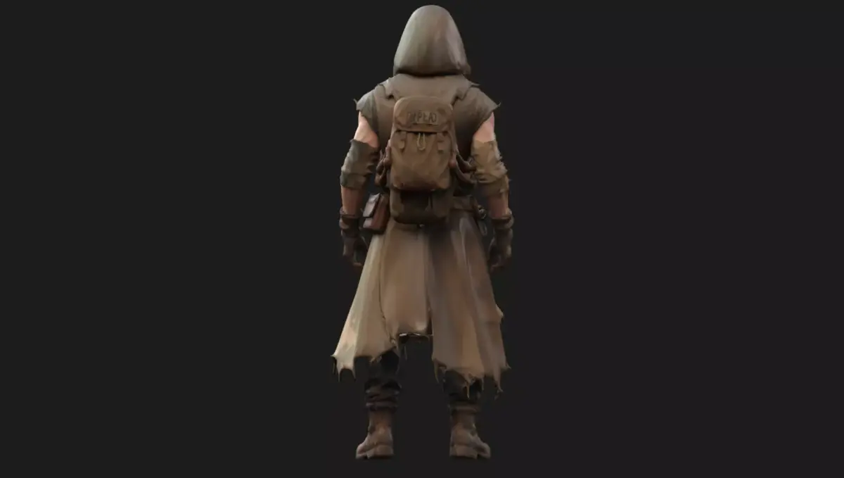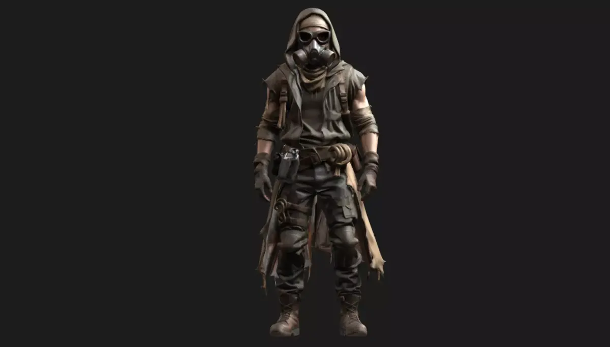 This character features layered clothing, weathered fabric materials, tactical belts, utility straps, boots, and a gas mask with goggles — perfect for wasteland, survival, or FPS/TPS projects.