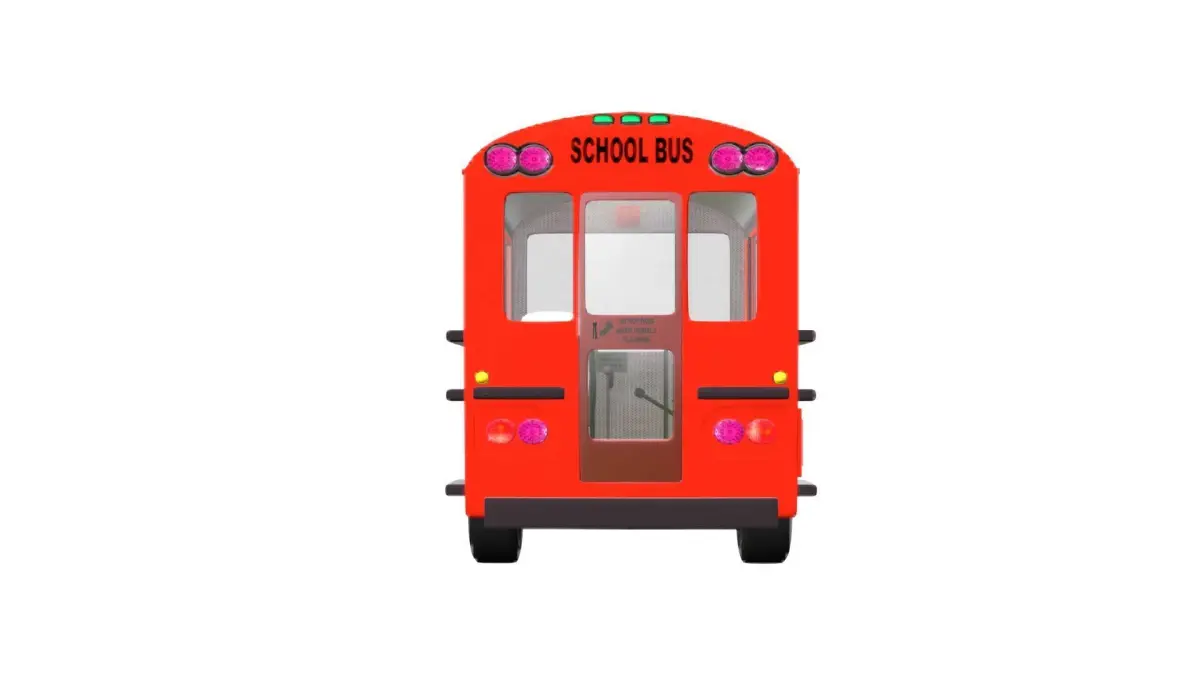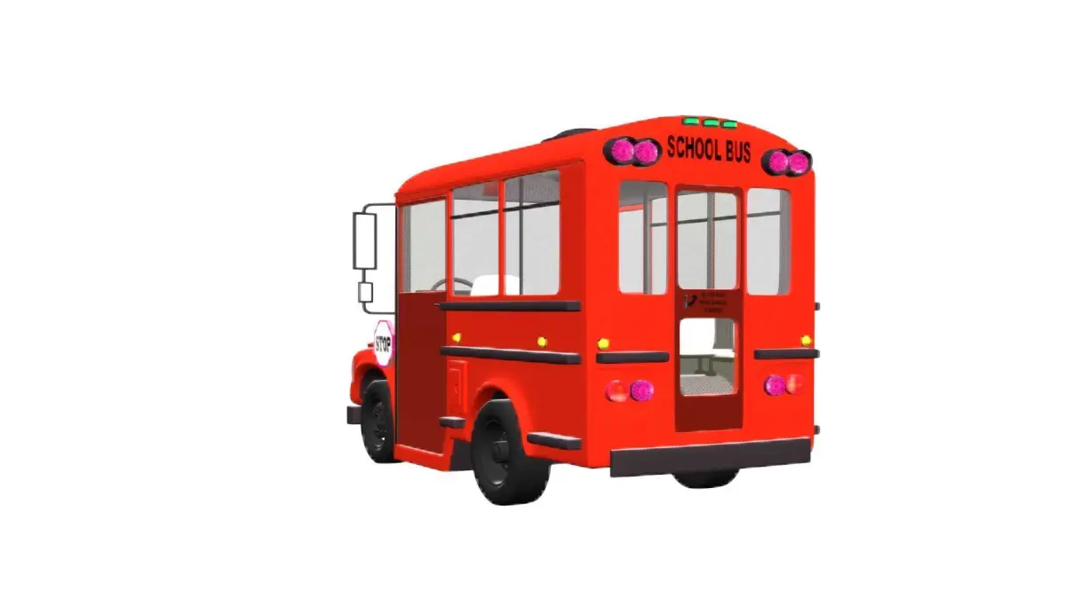 The cartoonish school bus 3D model features a bright, cheerful red body with black stripes along the sides. Large windows with a slight tint and realistic reflections line both sides. The front has a rounded hood, detailed headlights, a bold grille, and a clearly marked school bus sign above the windshield. Side mirrors extend for visibility, and a stop sign arm is ready to extend from the driver’s side. The doors have precise grooves and a transparent glass section. The wheels are large and rugged, with detailed rims and tires for various terrains. The rear includes taillights, a bumper, and emergency exit markings. This cartoonish 3D model is perfect for VR and video games.