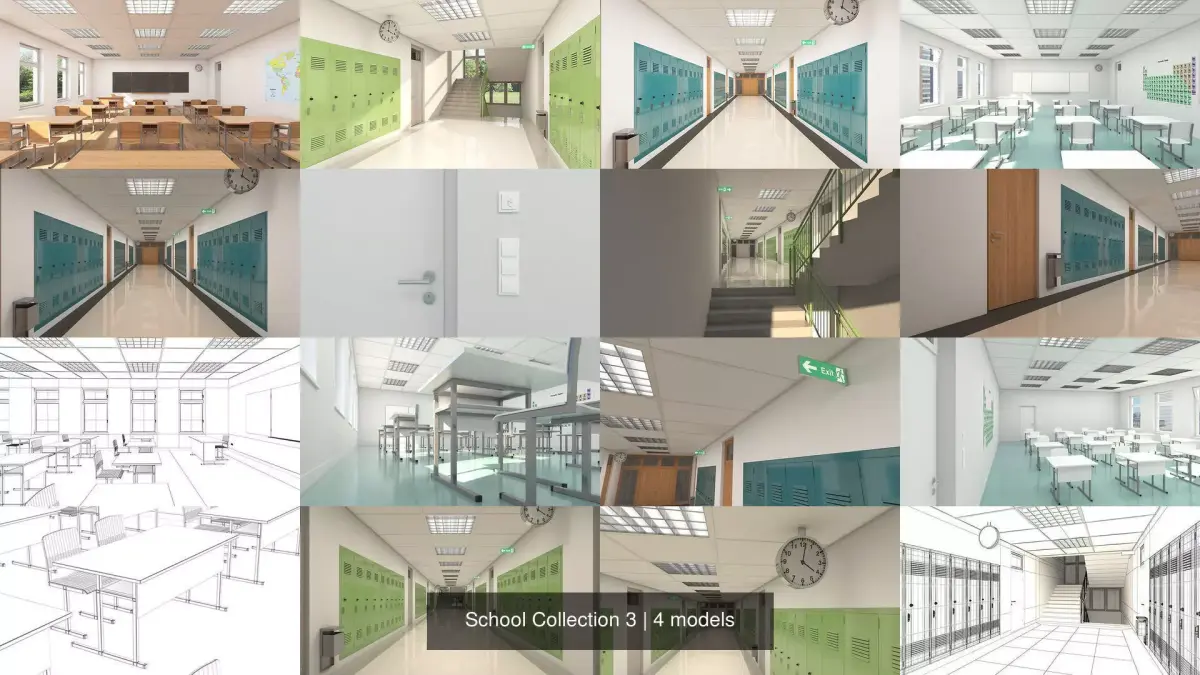 A COLLECTION OF FOUR INDIVIDUAL SCHOOL SCENES - CLASSROOM INTERIOR x 2, HALLWAY x 2: