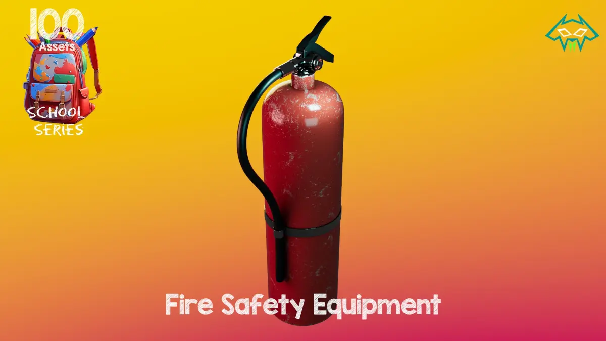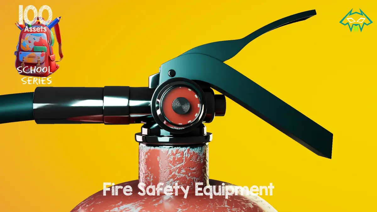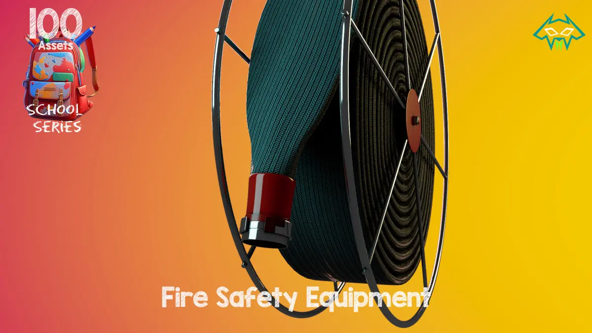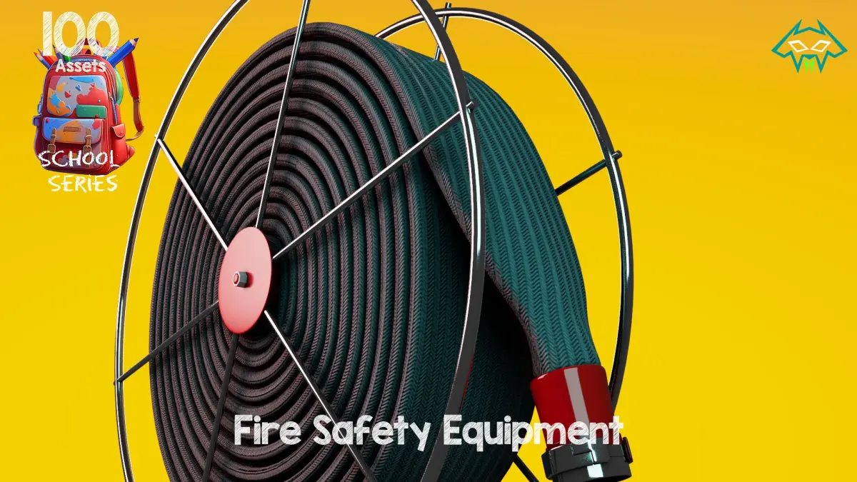 A collection of 3D models of fire safety equipment, featuring a red fire extinguisher secured inside a case with metallic straps and a black hose with a nozzle. Alongside it, a fire hose is neatly coiled on a metal wheel with red accents, creating a ready-for-use appearance. The glass door of the extinguisher case is slightly fogged, adding realistic texture with visible reflections. . it Includes a Maya file, fbx, and a Blender file for each item. They have clean topology, they have 4k textures, They use udim workflows, textures are pbr textures, all models are low poly and sub-dividable.