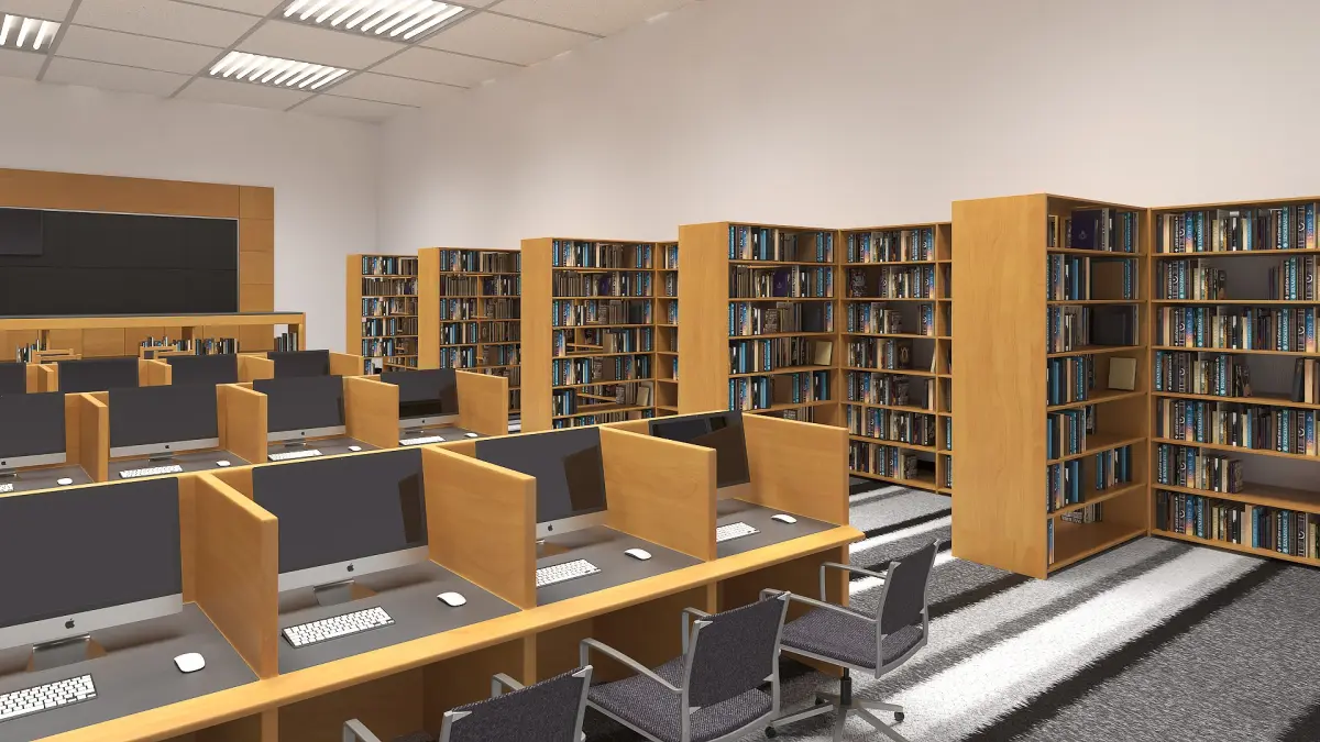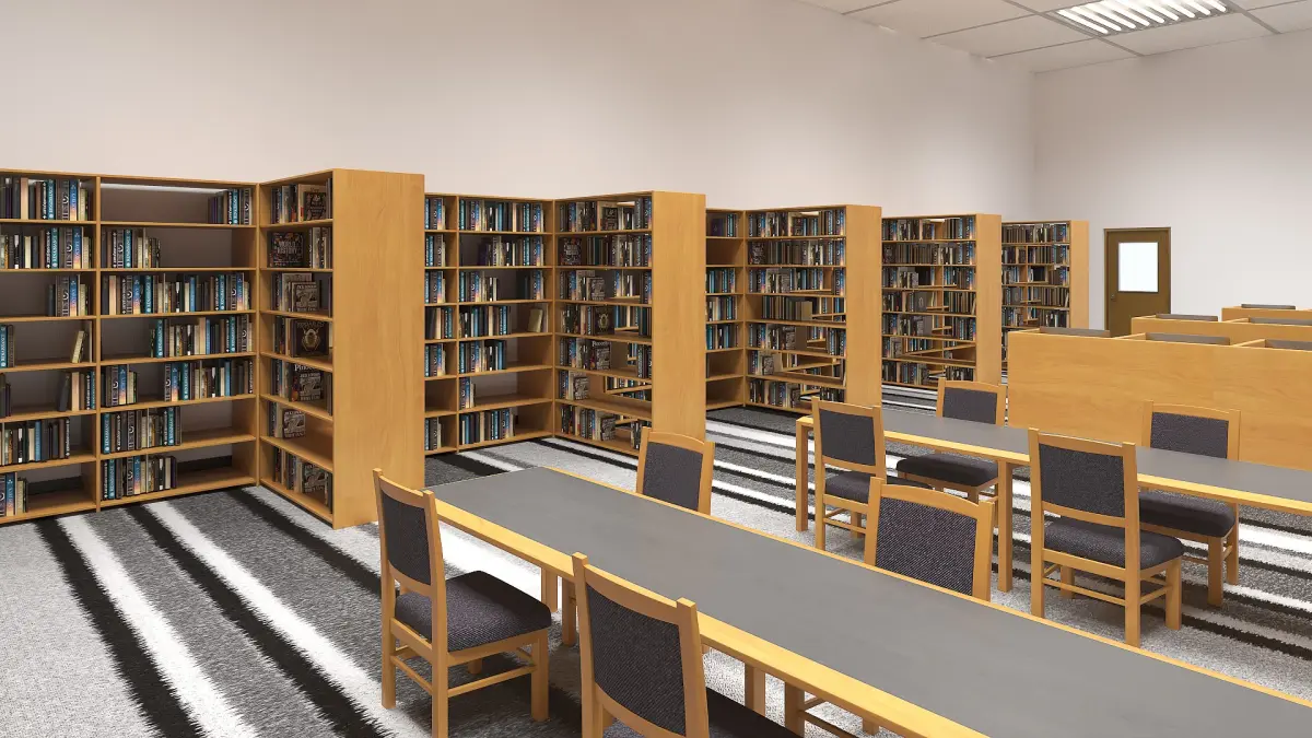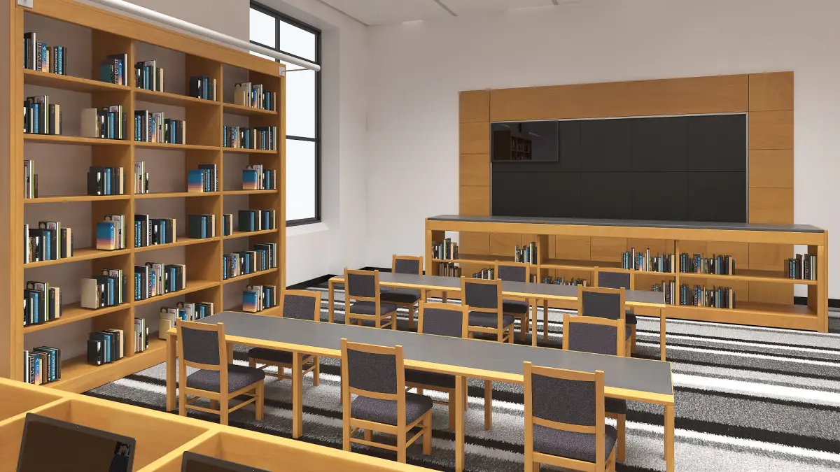 Library interiors today are multifunctional, combining clean lines, open spaces, and natural materials. Reception areas offer welcoming assistance, and special furniture ensures a balance between aesthetic appeal and user functionality. Bookshelves provide easy access to collections, while tables and chairs support focused study.