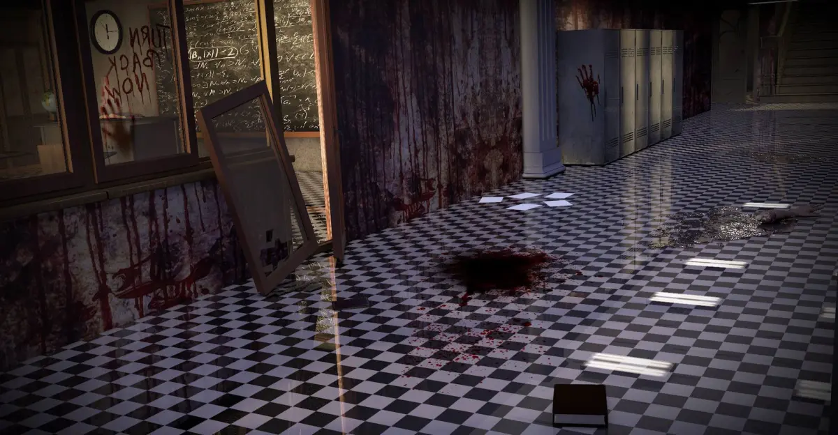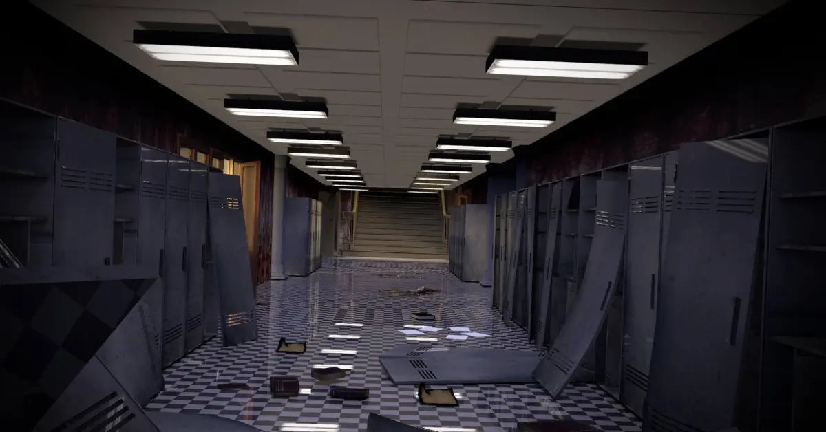 A Little Horror screen, a school hall way with lockers.