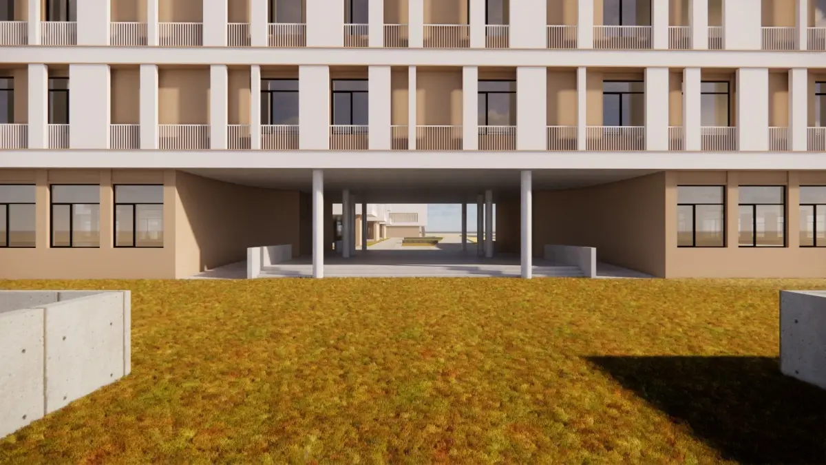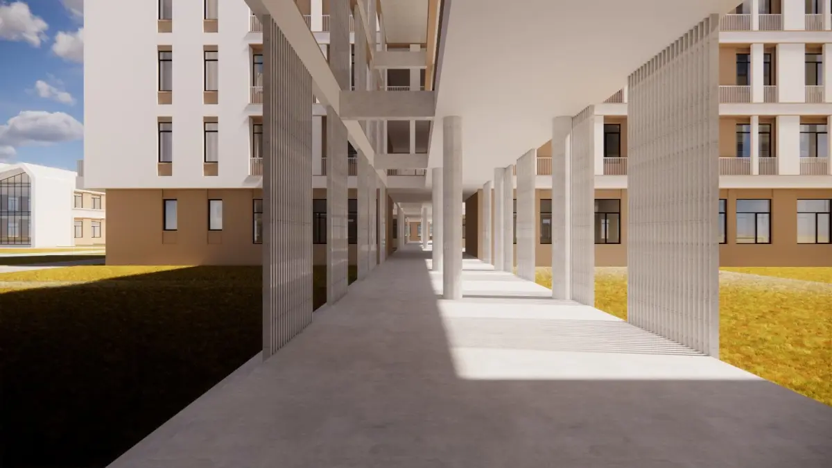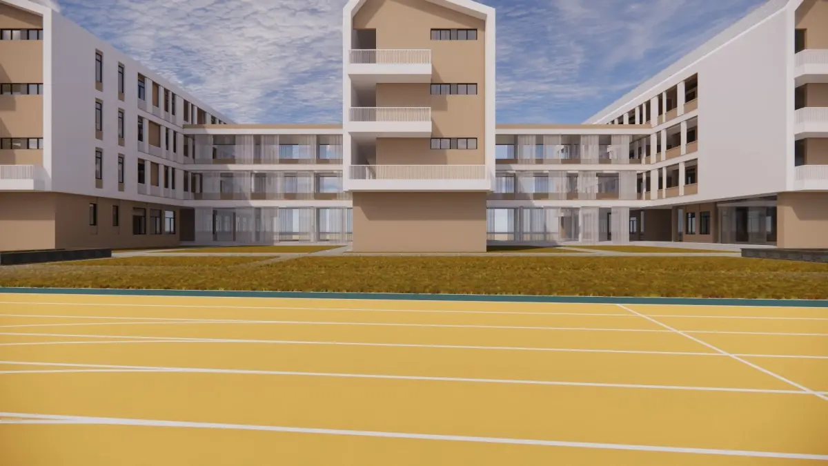 [School] This architectural plan is named “OASIS”, inspired by the large green space in the center of the building. It is a modern school building with a simple and elegant appearance, with gray roofs and multiple levels. The green space has a basketball court, a playground, and a walking path where students can exercise and relax. The surrounding trees and blue sky create a peaceful and tranquil atmosphere.