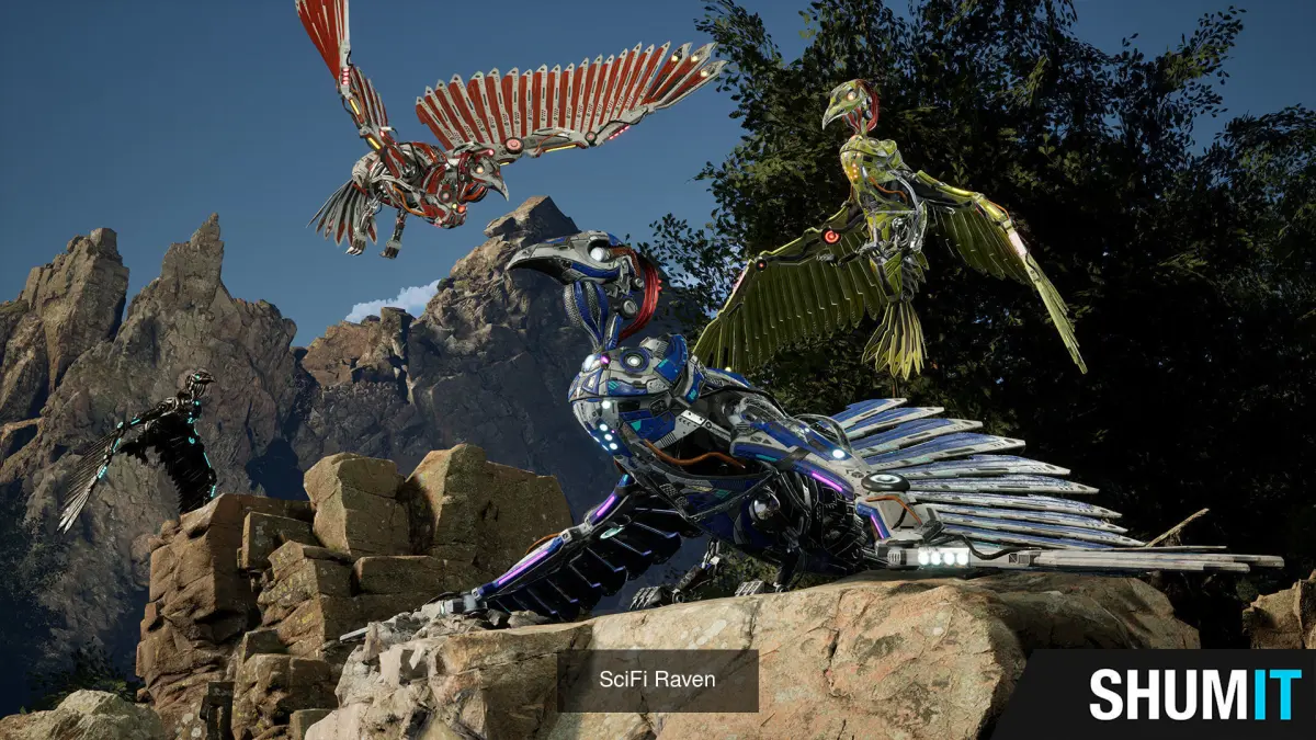 SciFi RavenCharacter has Custom skeleton (Image skeleton preview included)5 skins.Inst Mat color blending for each skin38 animation includedAttack - 6Walk - 3 (F, L, R)Idle - 5GetHit - 12Death - 3Fall - 3Flying - 3 (F, L, R)FlyingToIdle - 1Idle1ToFlying - 1WakeUp - 1Character:Triangles: 32 658Vertices: 22 072