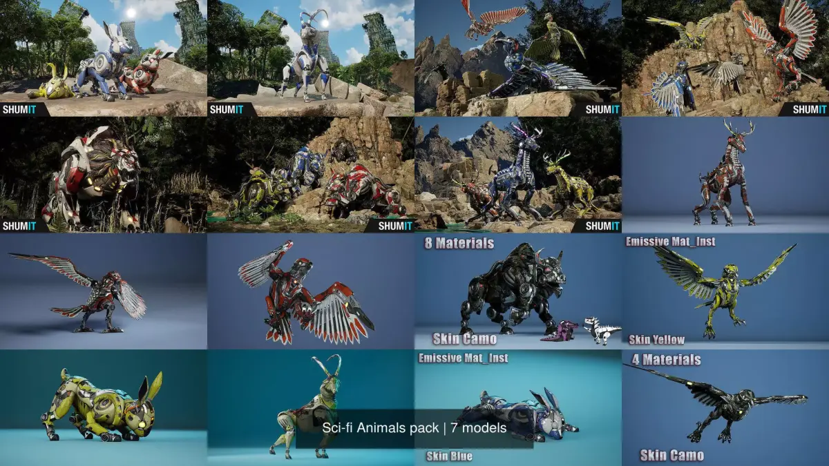 SciFi DeerCharacter has Custom skeleton (Image skeleton preview included)4 skin.Inst Mat color blending for each skin24 animation includedAttack - 4Walk - 3 (F, L, R)Run - 1Idle - 2Idle Look Up+Down - 2GetHit - 8Death - 3Turn180 - 1Character:Triangles: 56 597Vertices: 35 963