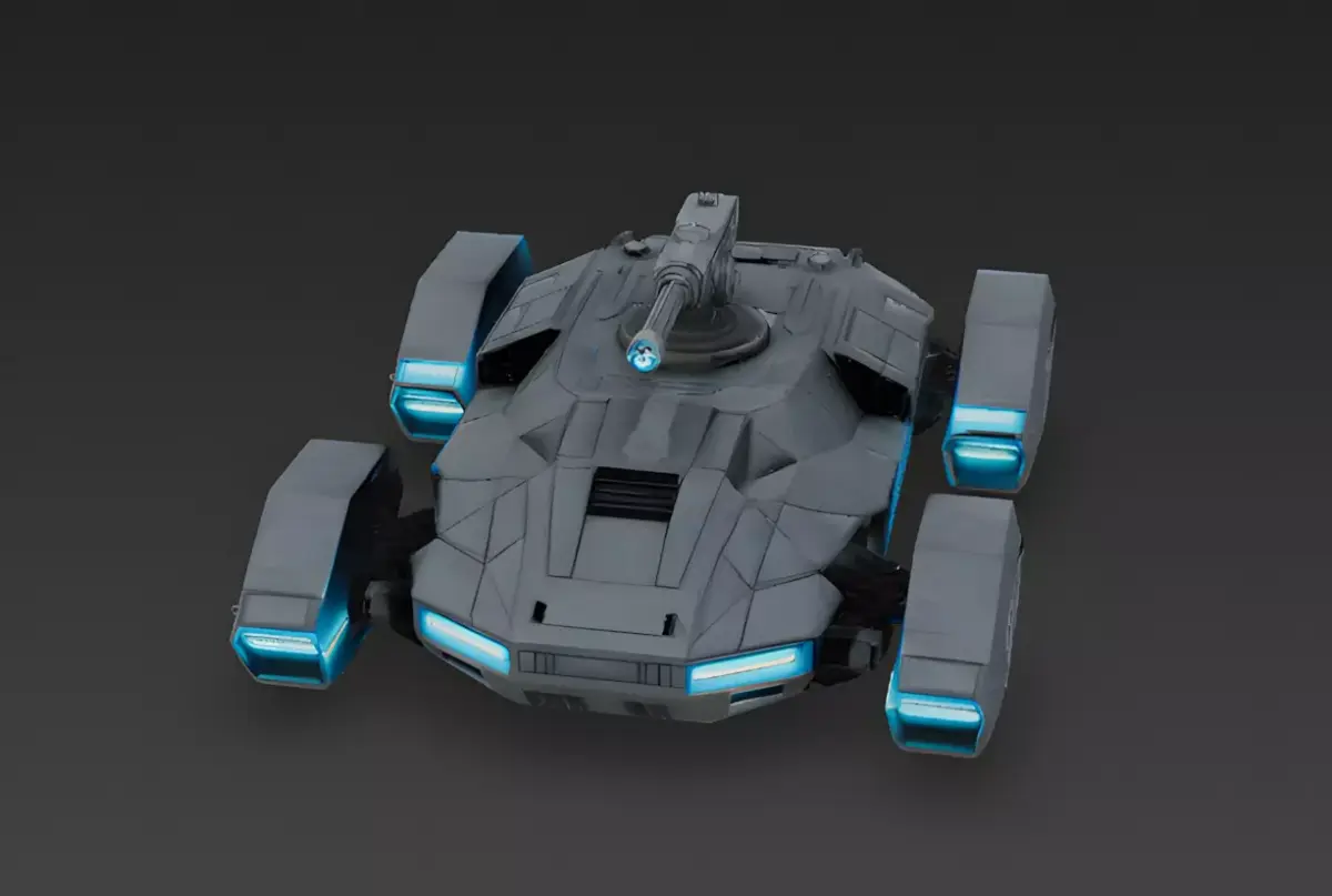 The Overall Concept This asset is a futuristic combat vehicle that uses anti-gravity technology to float above the ground. Unlike traditional tanks with heavy tracks, this machine glides effortlessly, making it perfect for high-tech war games.