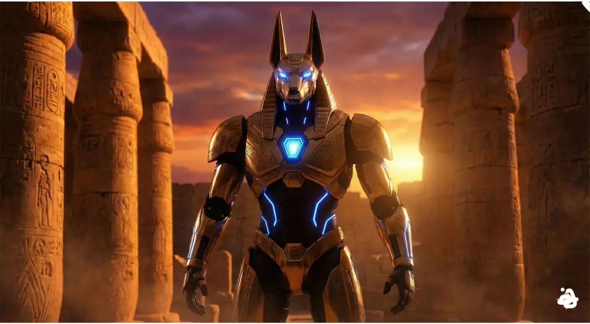 Unique Design: A fusion of classic Pharaonic armor (Gold & Black) with high-tech mechanical joints and emissive neon blue details.