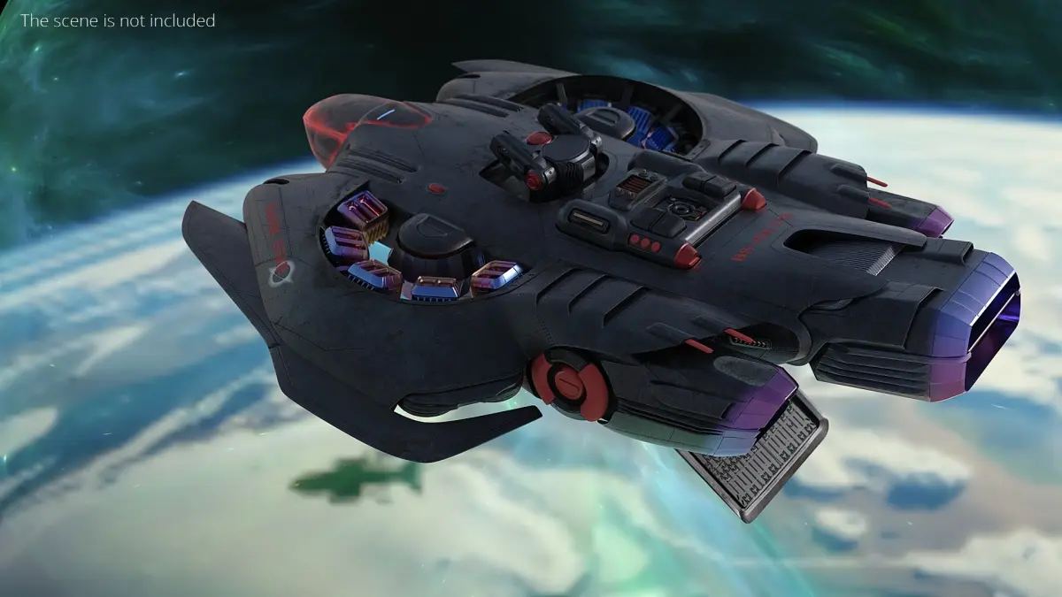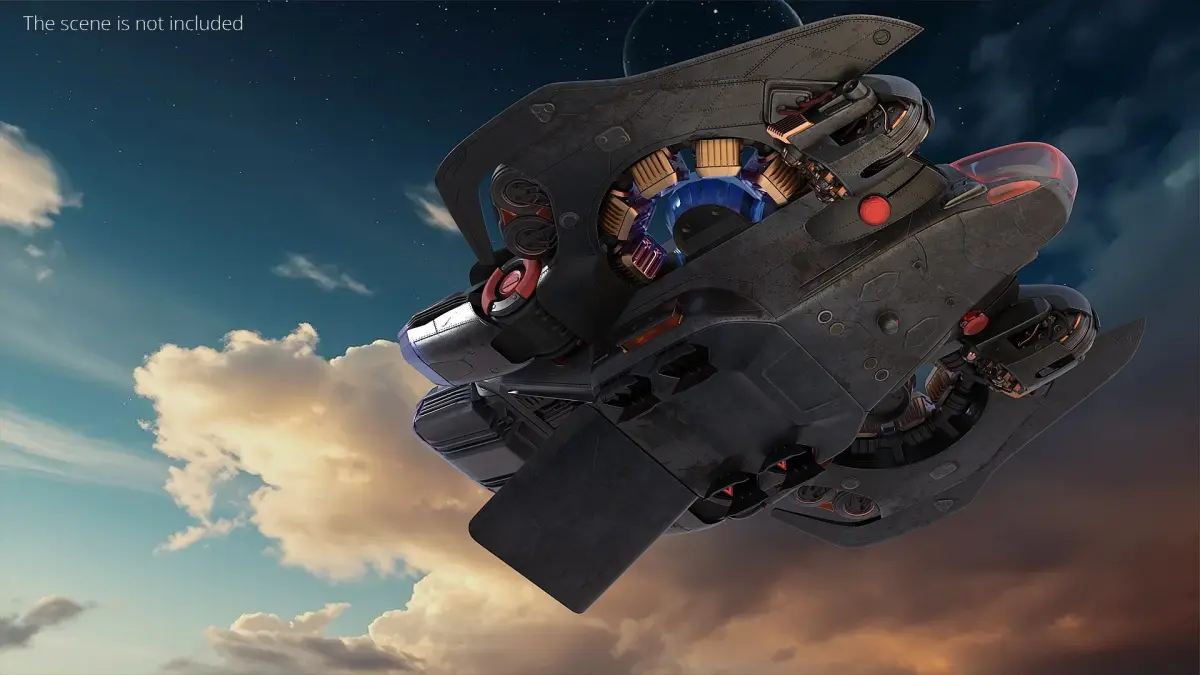 This detailed sci-fi dropship features a robust aerodynamic hull with reactive armor plating, vectored thrusters, and reinforced landing gear. Its cockpit is encased in a translucent red canopy, while mounted weapons, engine cores, and tactical lighting are embedded throughout the design. Fully rigged for animation, the model includes movable parts for engines, hatches, and turrets, optimized for both cinematic and real-time applications.