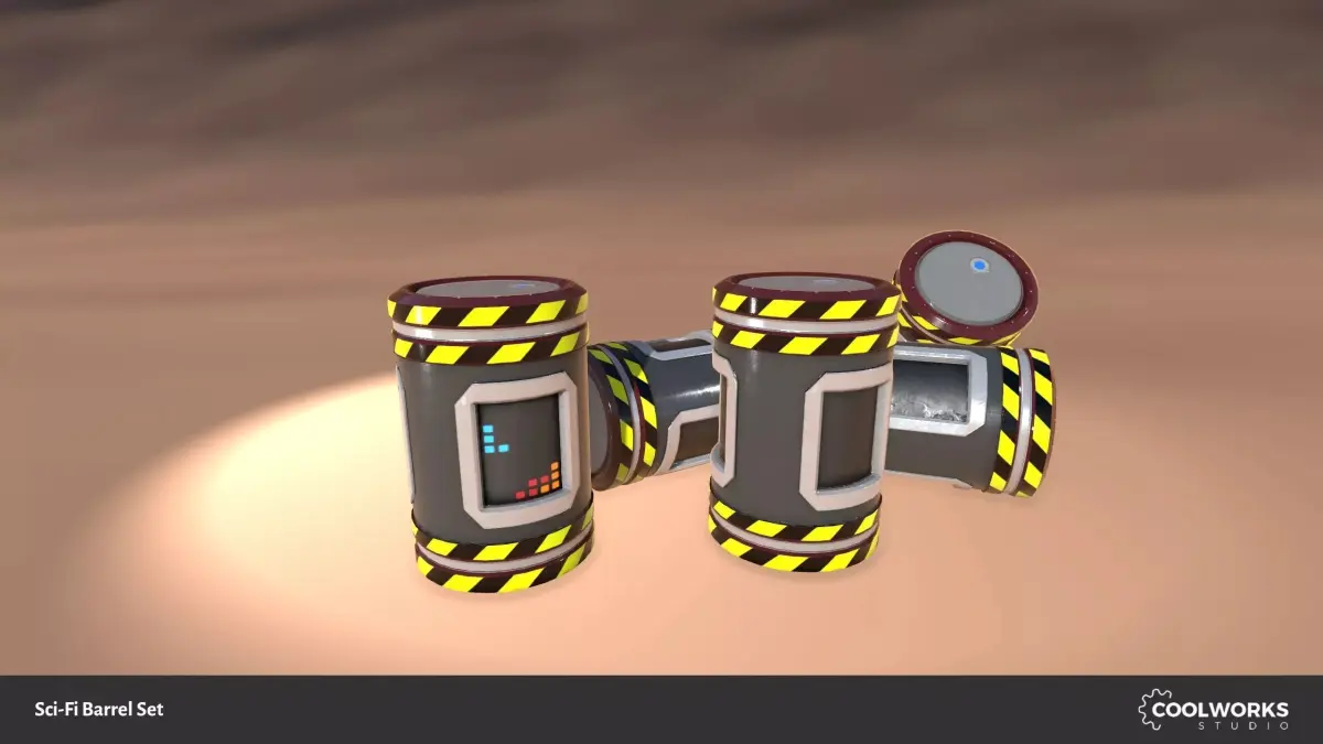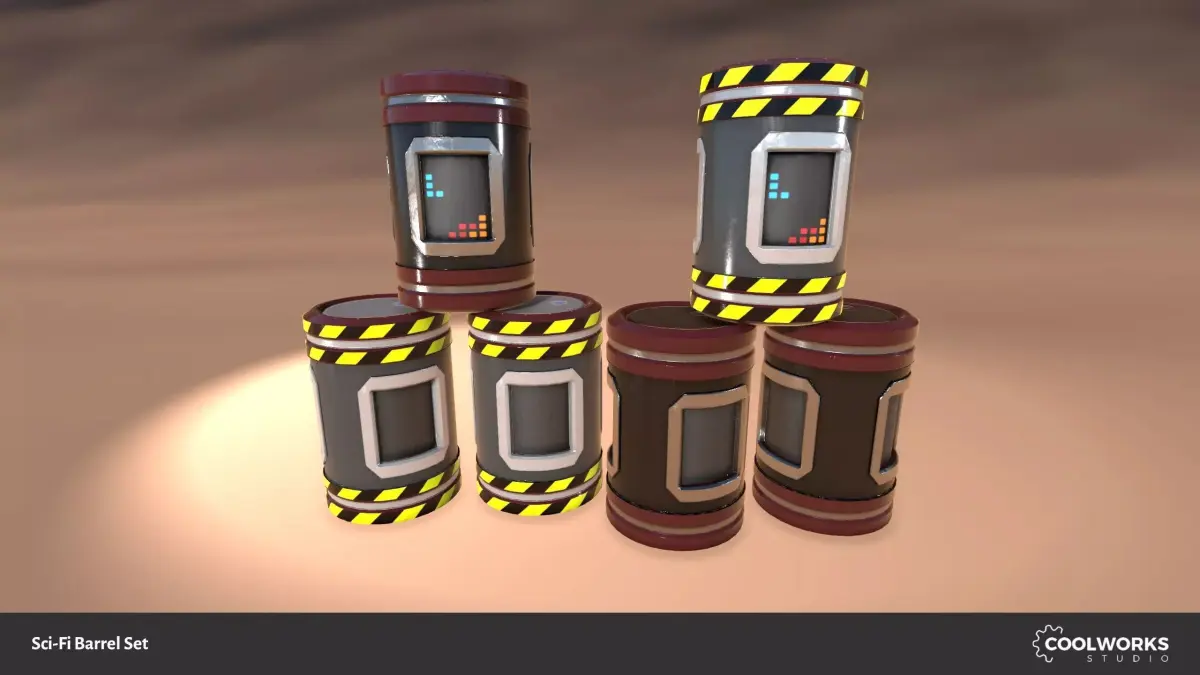 Set of four sci-fi barrels with or without animated display with looping tetris game, simply combine texture variants to get animated tetris texture or black screen on both color versions.