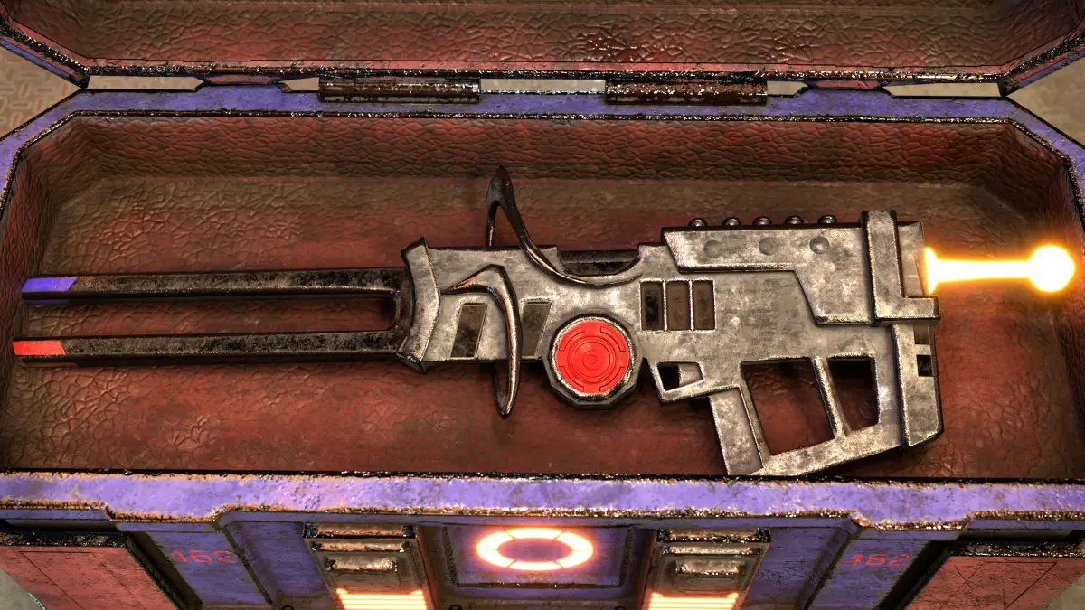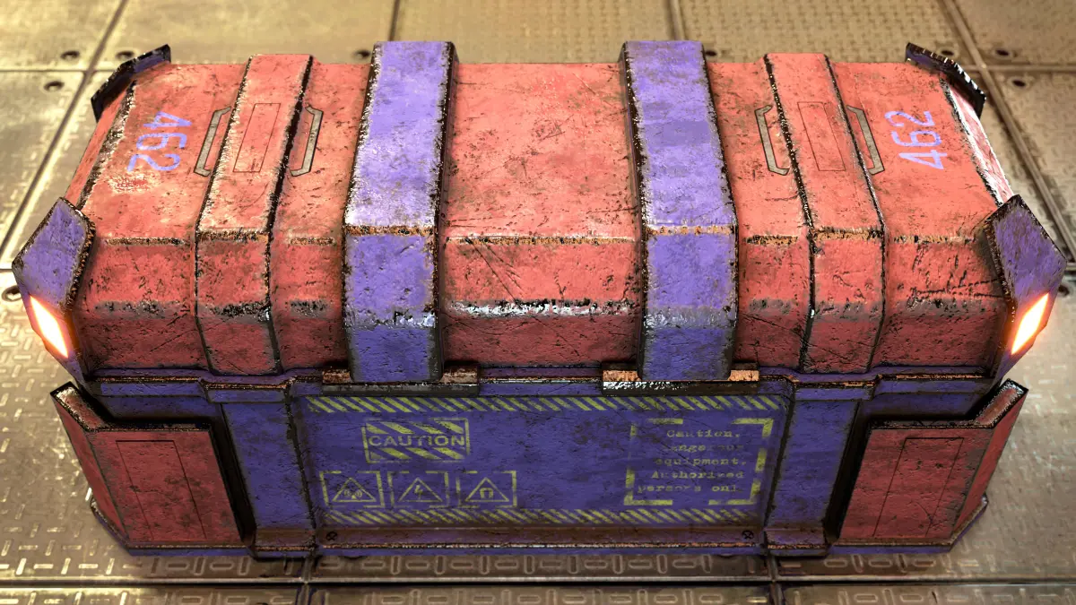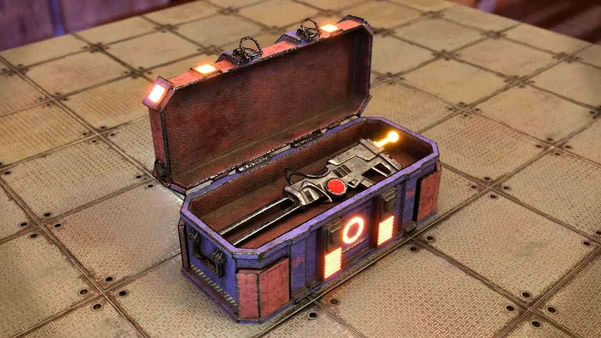 The scene contains three objects, the Magnezone Weapon (single object) and the Sci-Fi Chest (upper and lower parts), and each contains the Base Color, Emission, Metalic, Normal and Roughness maps in .png format;