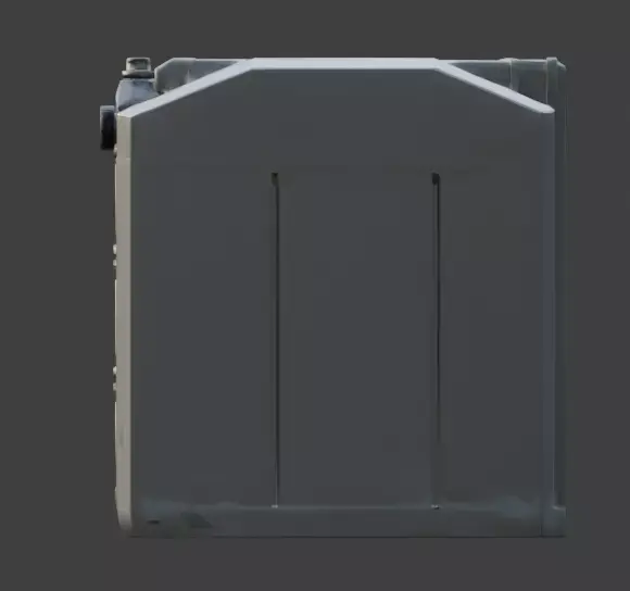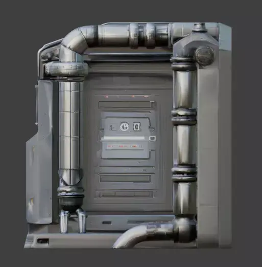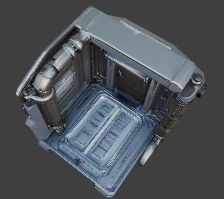 The asset features a matte metallic finish with realistic surface paneling, ventilation grates, and mechanical joints that suggest a functional, modular construction style.