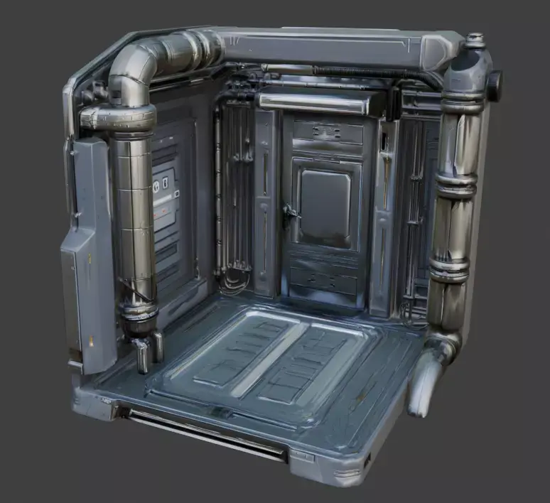 It is equipped with complex environmental detailing, such as a sealed sliding door, exposed futuristic piping, and bundled industrial wiring along the wall panels.