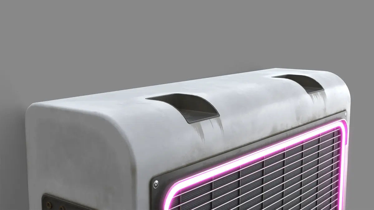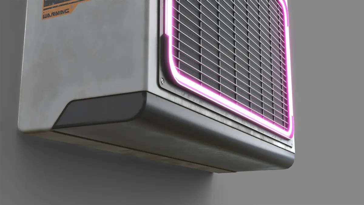 A sci-fi cyberpunk air conditioning unit. Created in Blender and textured in Substance painter. Uses baked textures including baked normals. Has one 4k set of textures. High texel density, which is ideal for FPS games or cinematics. Normal maps are in OpenGL style. Topology is all quads and tris.