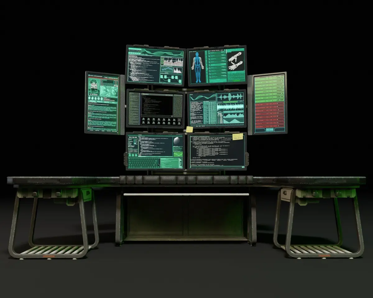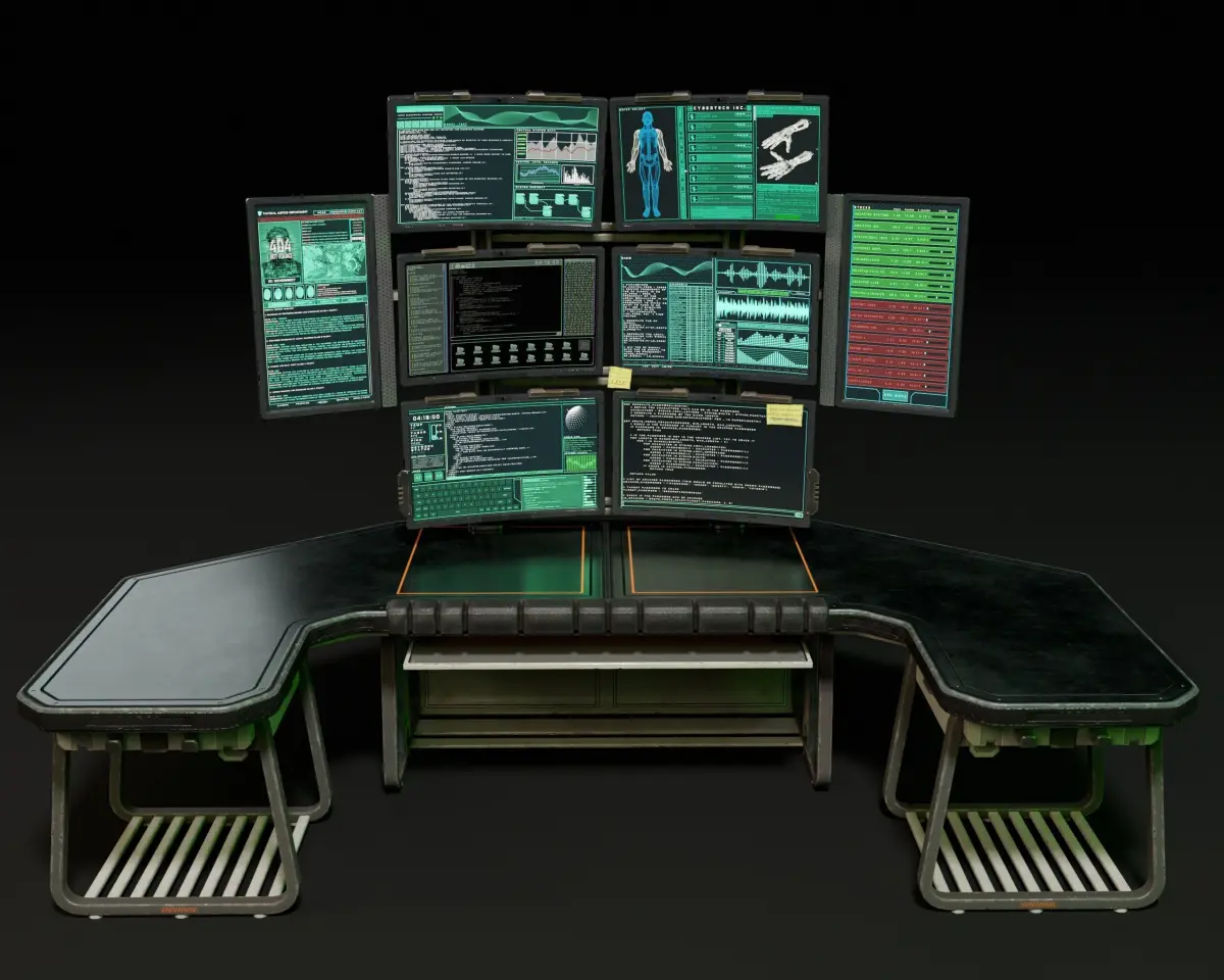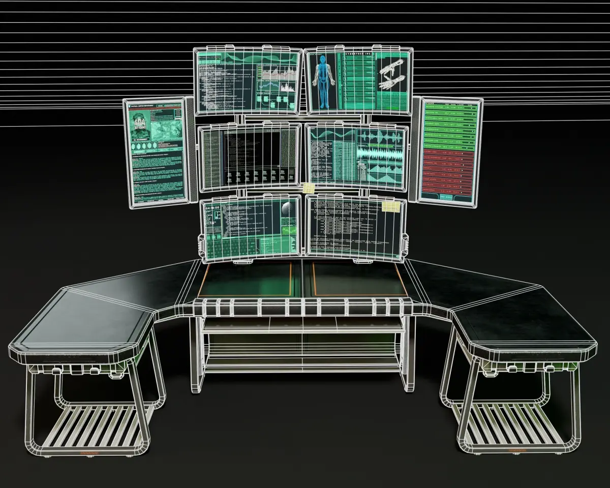 Sci-Fi Desk And Monitors - Hacker Scene 3D Model. This model contains the Sci-Fi Desk And Monitors - Hacker Scene itself