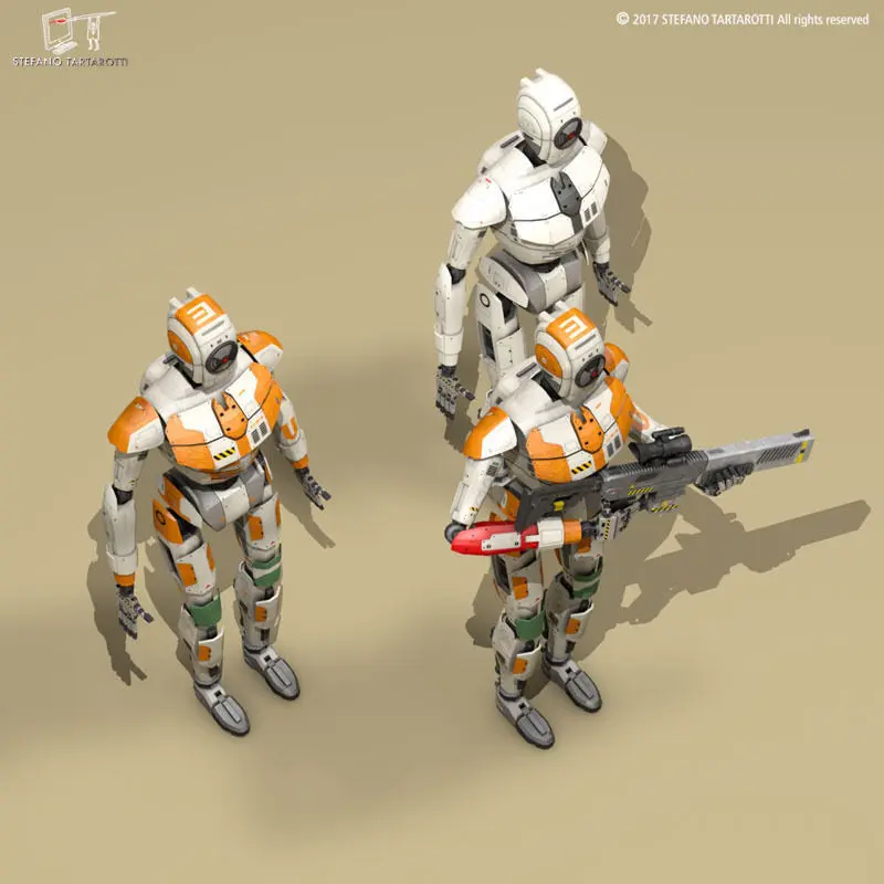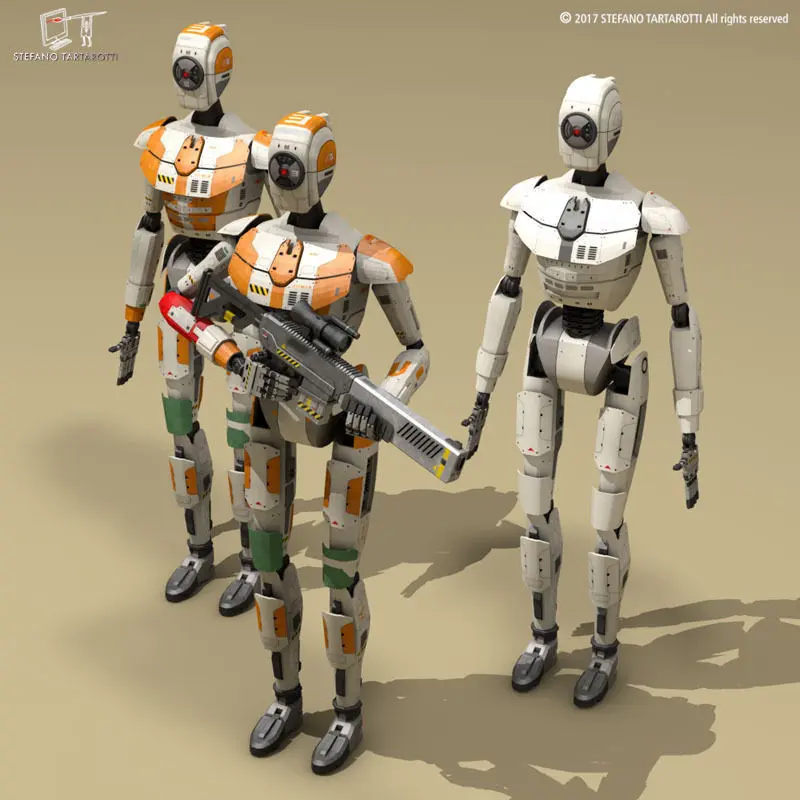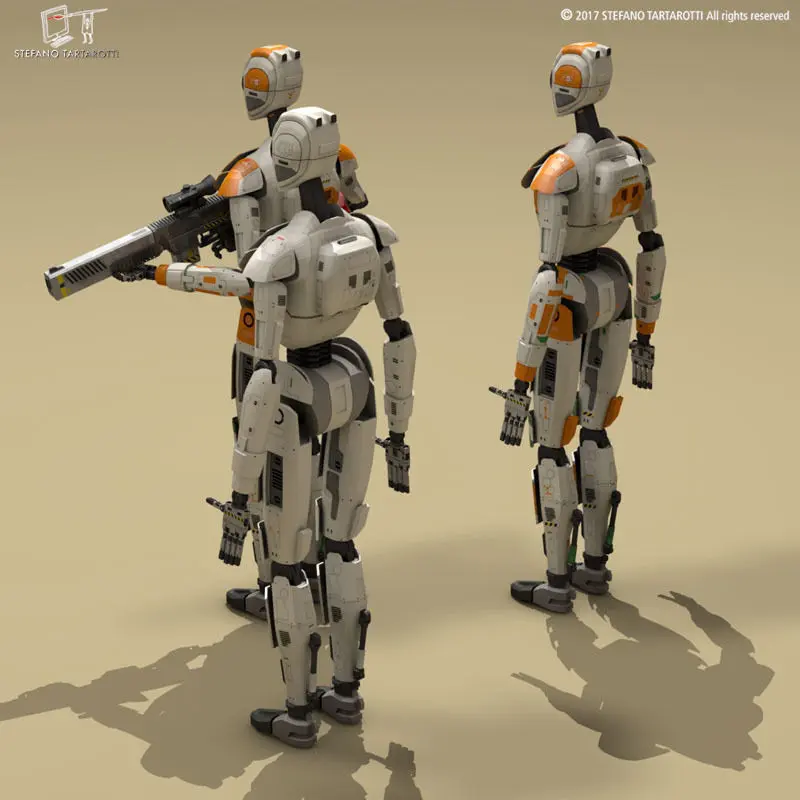3d model of sci-fi droid with original design and sci-fi rifle model enclosed.The model has three texture kit: an all white texture, a white-orange texture and a white-orange with a red arm texture The model is not rigged but each body part is grupped correctly with other parts. So It can be posed rotating the joint points.Made in cinema4d R12. Other formats have textures too. .fbx format is good for importing in 3dstudio max and Maya. The basic droid counts:Polygons 22654Vertices 22976The droid with rifle counts:Polygons 28254Vertices 28974This model is only artistic representation of the subject matter. The design is original.