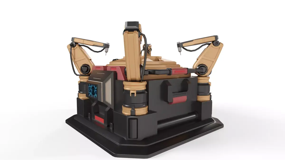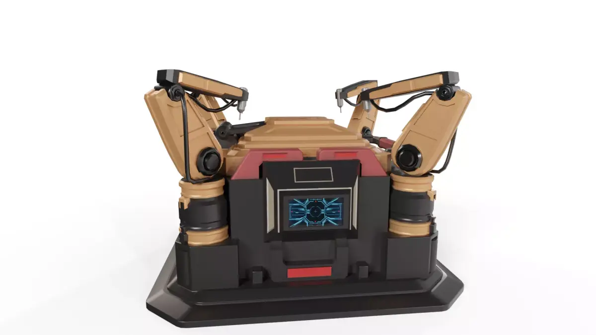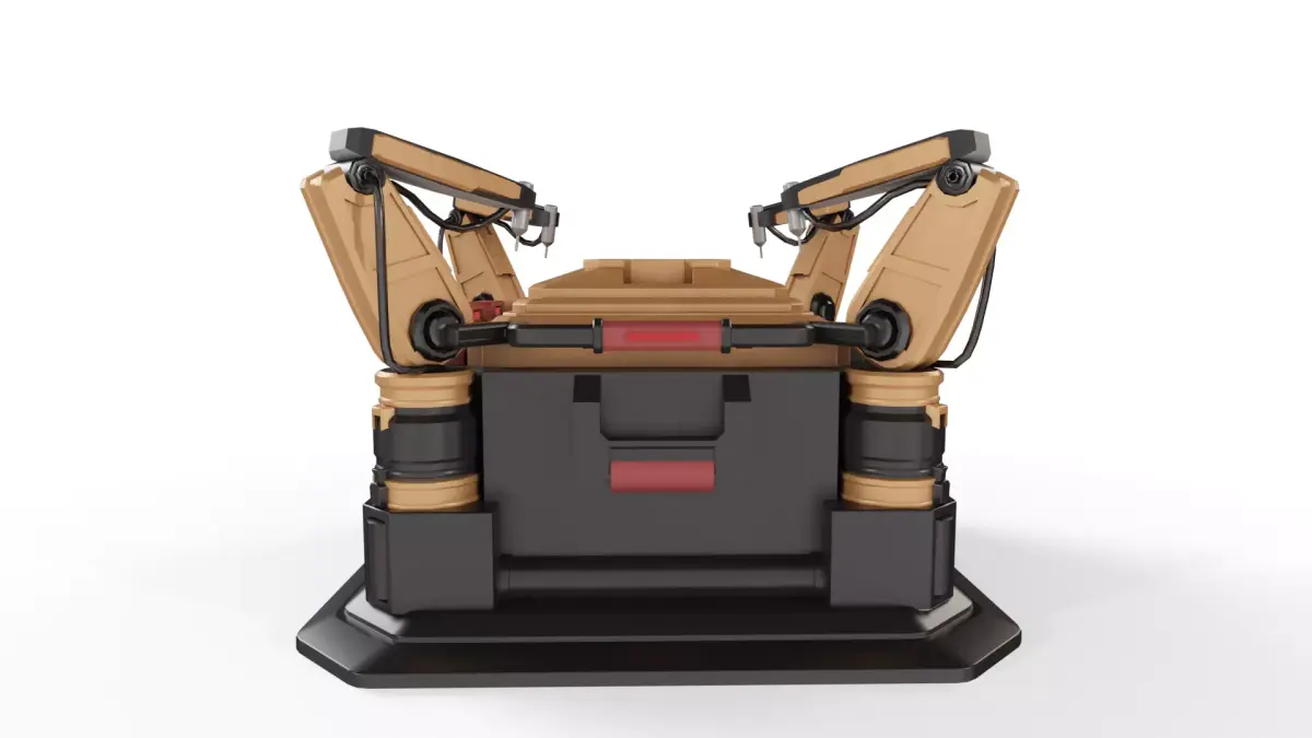 This highly detailed Sci-Fi Drone Launchpad. This asset is designed as a specialized deployment crate featuring integrated robotic arms and a mechanical docking interface, making it perfect for sci-fi hangars, military bases, or cyberpunk street scenes.