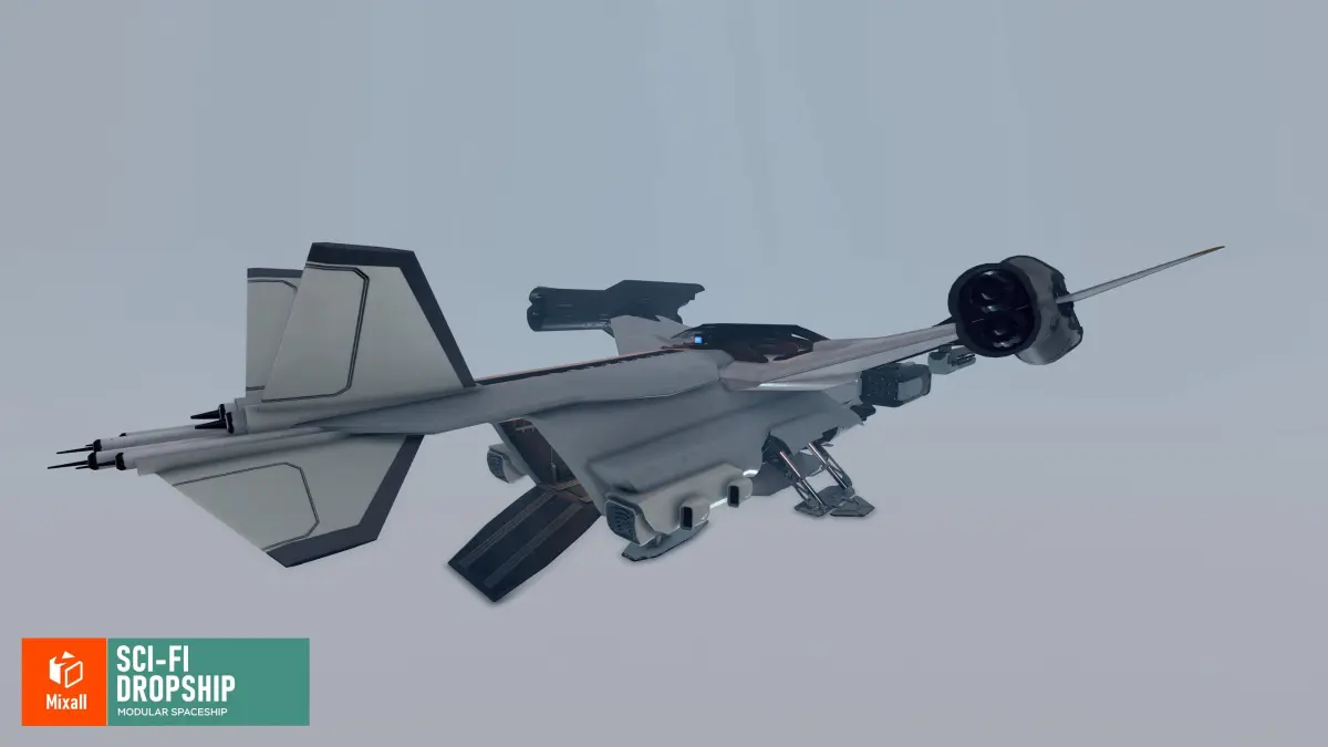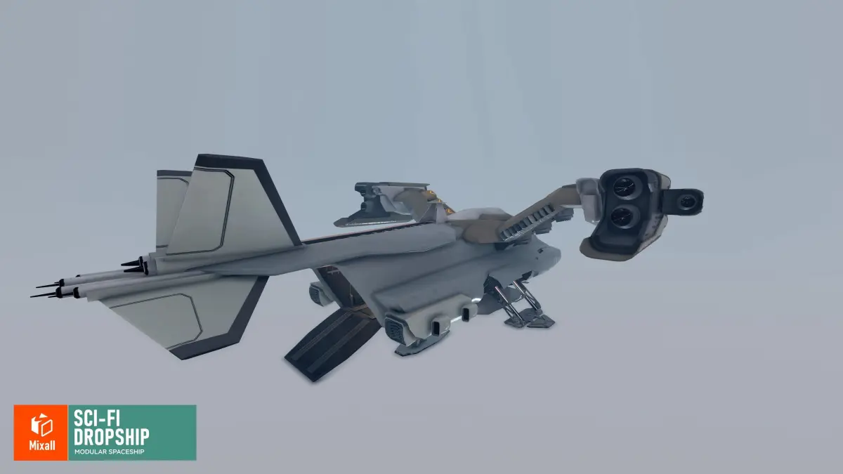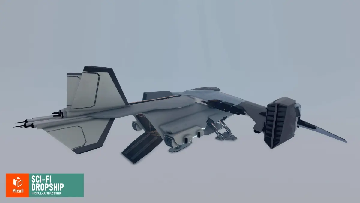 Mixall studio presents a good solution for your games, VR projects and simulators: Sci-fi dropship - modular spaceship.On this impressive asset pack, you will find very high quality meshes prepared for you to create fantastic space adventures. Key Features sci-fi dropship prepared for animation2 wing modules and 2 weapon modulesdetailed cargo bay and cockpit interiorgame ready demo sceneTextures: All texture maps PBR;Texture size: 512 x 512, 1024 x 1024, 4096 x 4096;Types of texture maps: Albedo, Normal, Metallic;UV mapping: Yes.Polygon count of:DROPSHIP_no_landing_Gear 185.2k trisDROPSHIP_LANDING_GEAR_Opened 52.3k trisDROPSHIP_LANDING_GEAR_Closed 52.3k trisDropship_Gun 4.2k trisDropship_Rocket_Launcher 31.9k trisDropship_Wing_CARGO 37.5k trisDropship_Wing_SPEED 16.4k tris