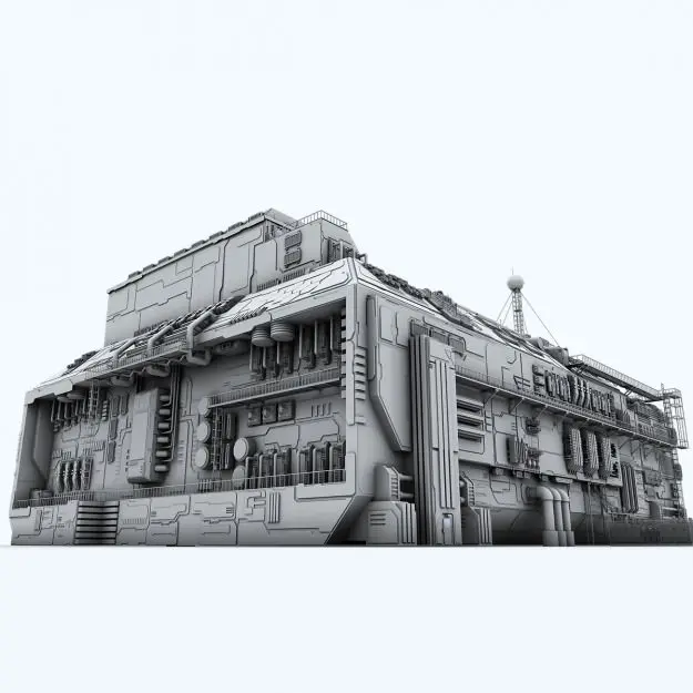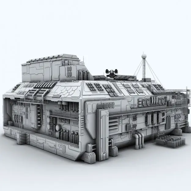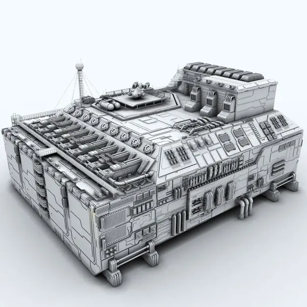 Highly detailed sci-fi factory model with landing pad and small transport ship on it.