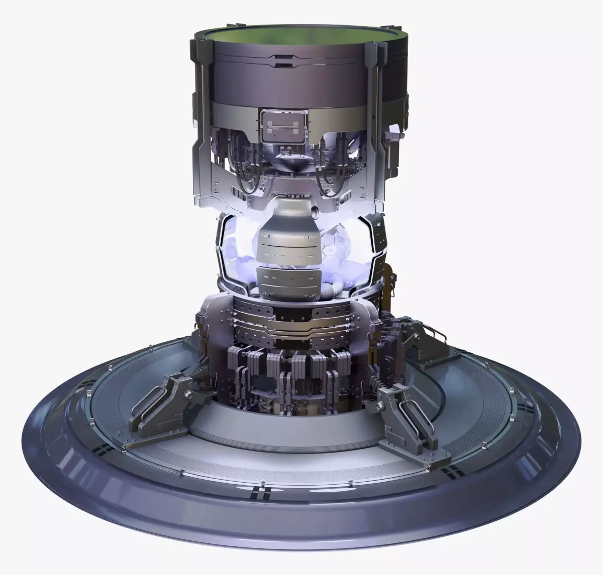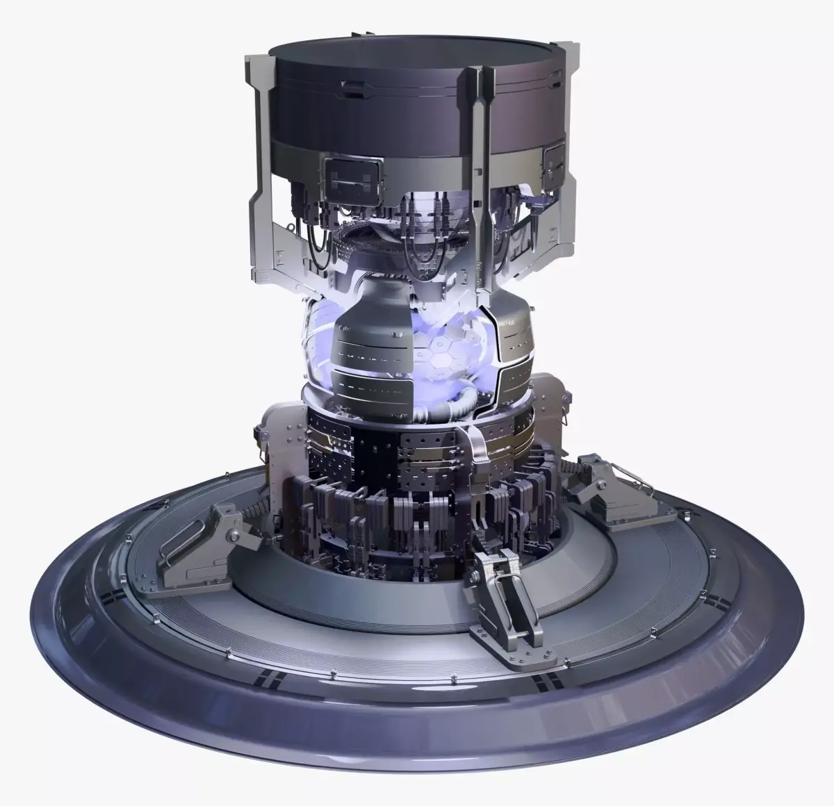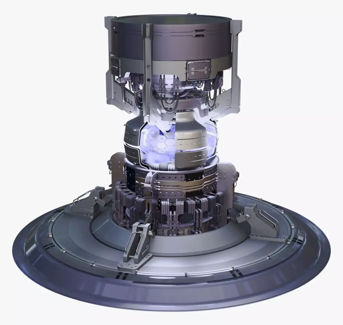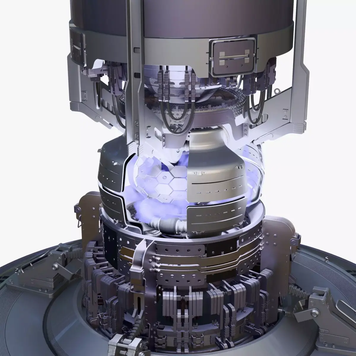 A highly detailed sci-fi fusion reactor core featuring layered mechanical assemblies, magnetic containment elements, and an illuminated central energy chamber.