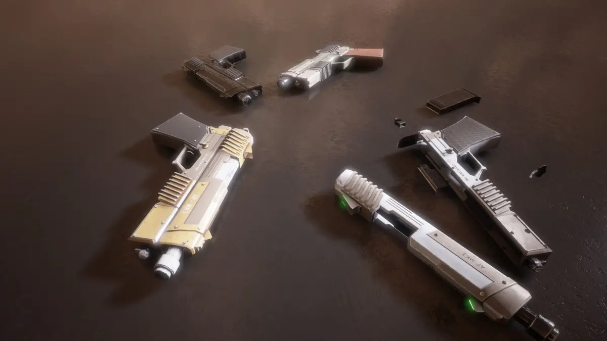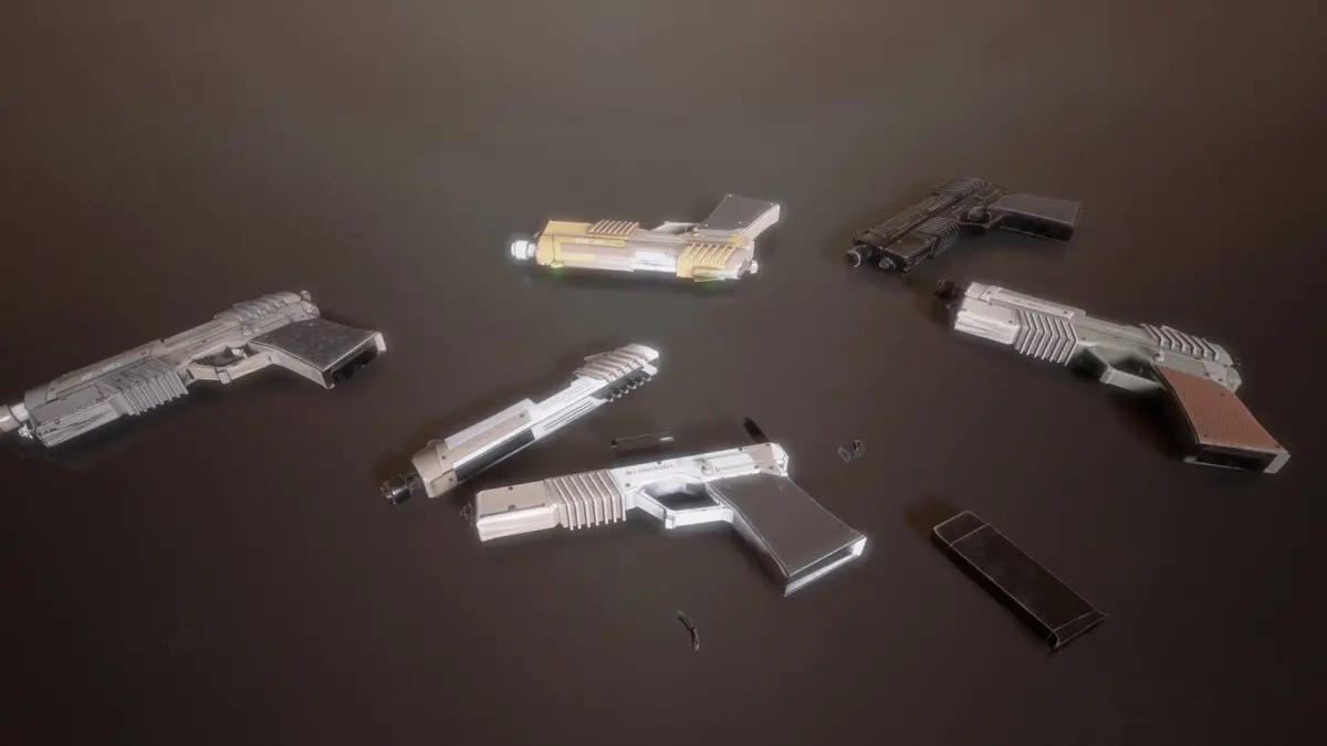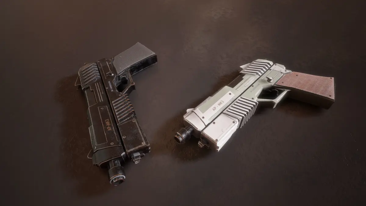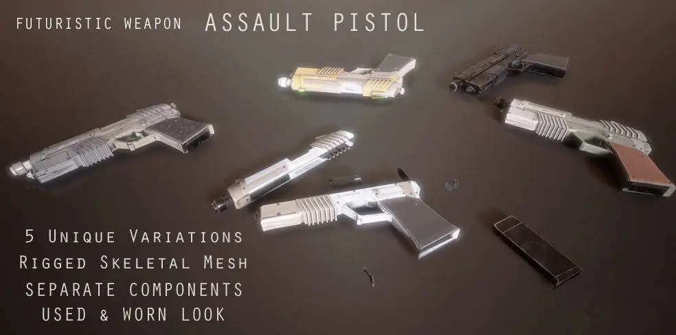 The assault pistol is a futuristic conventionally designed weapon with a used look and feel. The assault pistol has 5 unique PBR variations. The pistol components are broken down into individual parts which will maximize the scope for animation and customization. The pistol also comes as a rigged and animated mesh for extra usage possibilities.