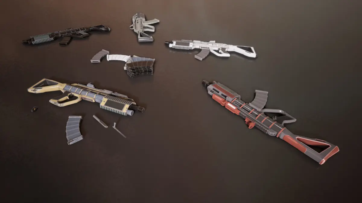 The assault rifle is a futuristic conventionally designed weapon with a used look and feel. The assault rifle has 5 unique PBR variations. The rifle components are broken down into individual parts which will maximize the scope for animation and customization. The rifle also comes as a rigged mesh for extra usage possibilities along with 6 animations.