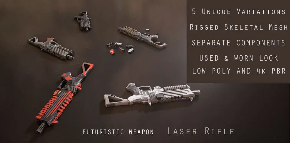 The Laser Rifle is a futuristic styled weapon with a used look and feel. The Laser Rifle has 5 unique PBR variations and the weapon also comes with batteries. The Laser rifle components are broken down into individual parts which will maximize the scope for animation and customization. The rifle also comes as a rigged and animated mesh for extra usage possibilities.