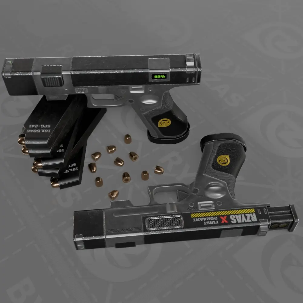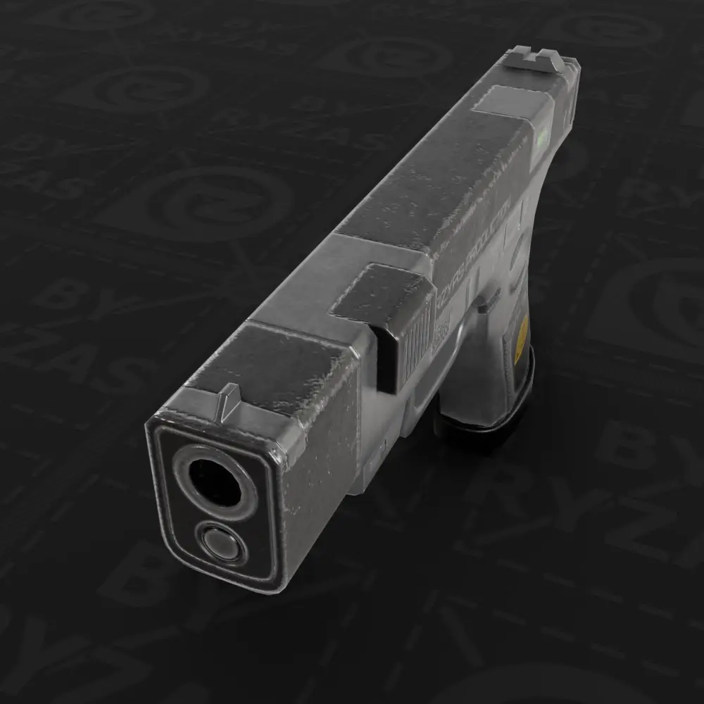 A simple sci-fi-themed pistol design, inspired by the Glock and still using conventional .45 AE x16 ammunition without gunpowder. The explosive force is generated from a power source located at the back of the weapon, allowing more rounds to be loaded since the gunpowder space within each round has been removed.