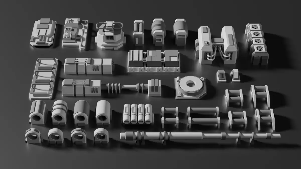 100+ greeble models, designed to be used in any sci-fi or industrial context. They are particularly well suited to models in the style of Star Wars.