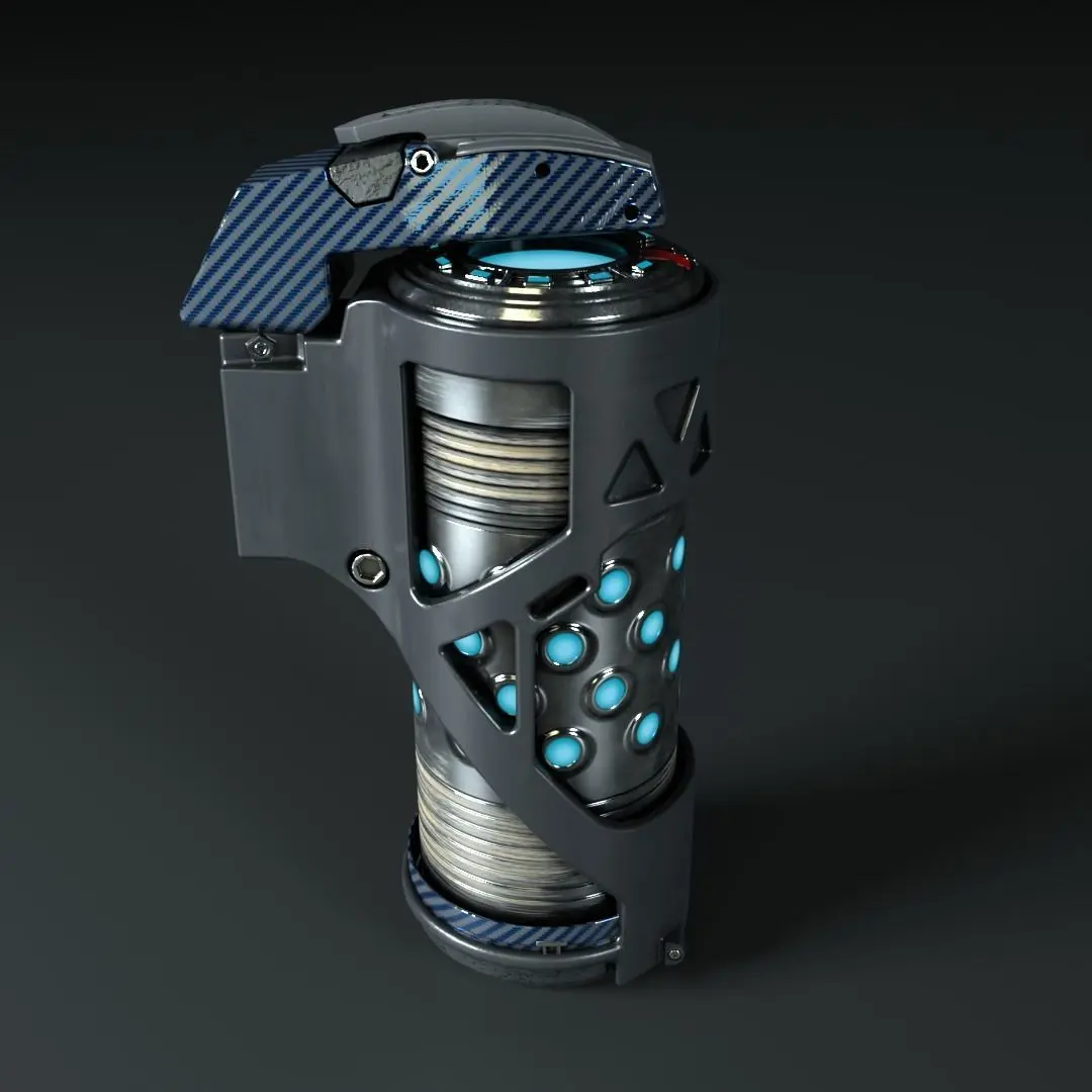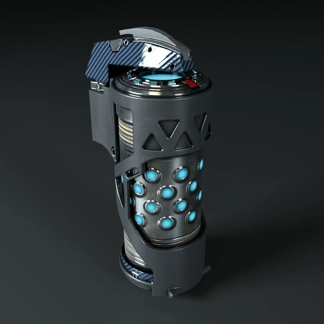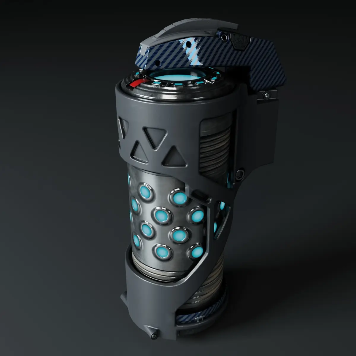 Sci-fi grenade made in Plasticity, retopo made in Blender, unwrapped in Rizom UVbaked & textured in Substance Painter7k faces, one PBR 2k texture set with 8 maps, five object in total (frame, head, flap 1, flap 2, stuff)