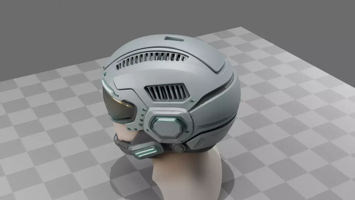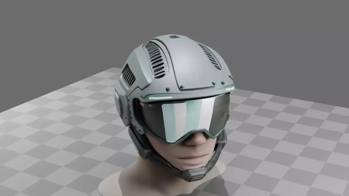 High-poly sci-fi military helmet with 494,900 polygons, featuring a sleek design with layered armor plates, detailed ventilation geometry, and subtle surface greebles. The model includes separate components (shell, visor, inner padding, emissive light strips) with distinct PBR materials—matte composite for the shell, glossy glass for the visor, and rubber detailing for seals. Supplied in GLB, OBJ, and BLEND formats with complete UV mapping. Suitable for game asset integration, VR/AR applications, 3D visualization, and film/animation production.