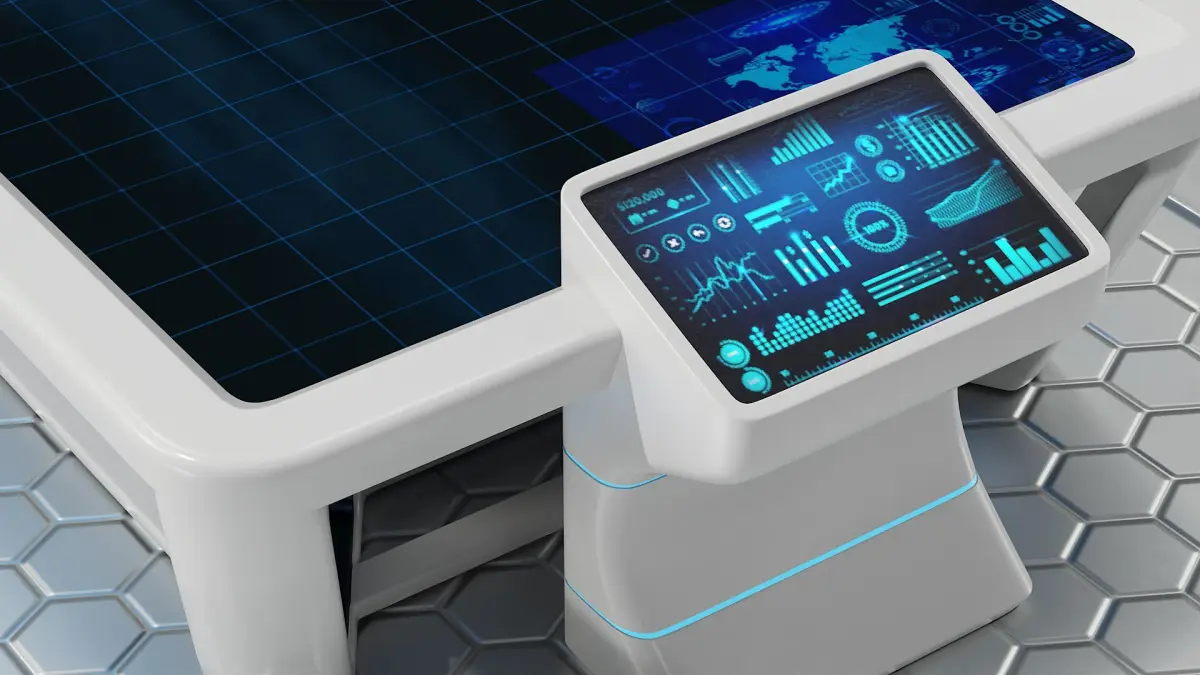 Sci Fi Holographic Tables Collection with futuristic innovative interactive control panel computerized devices.