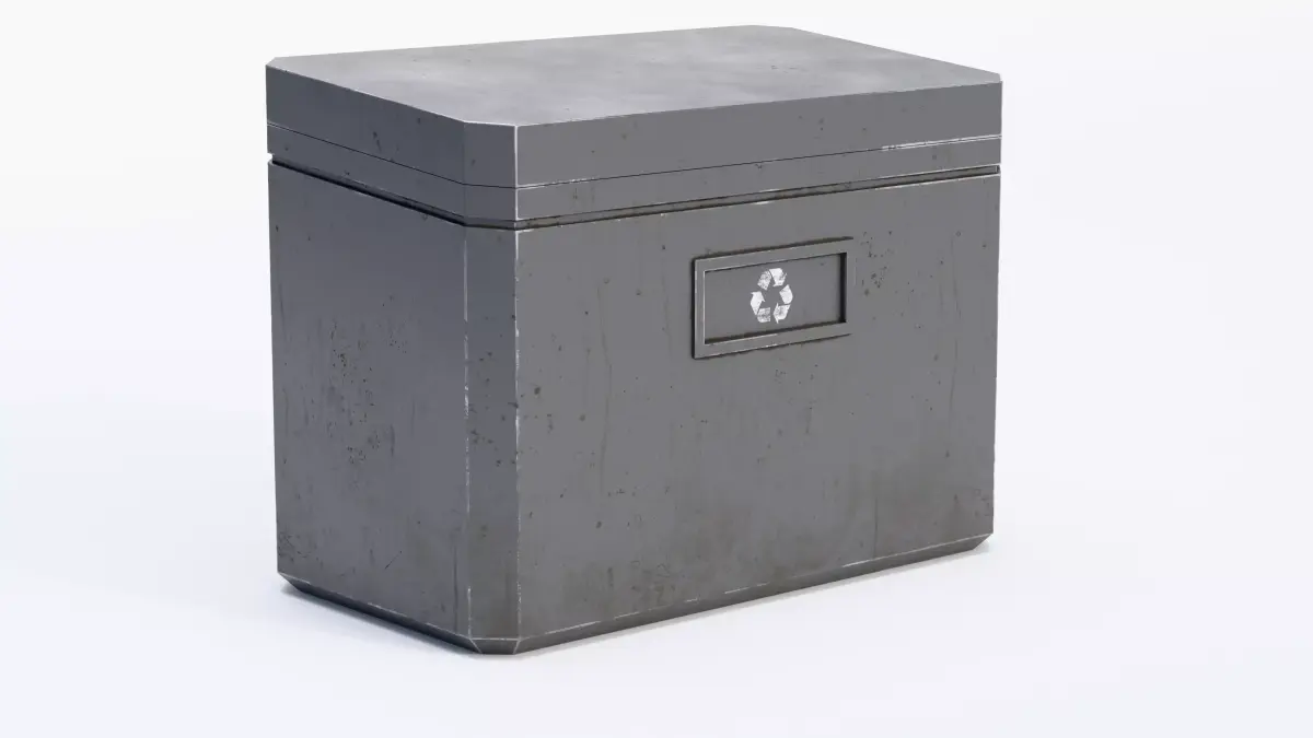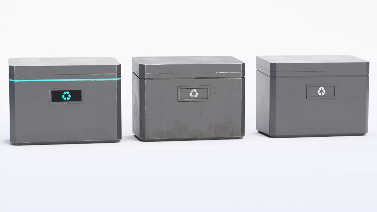 A high-quality 3D asset pack featuring a modular futuristic industrial dumpster presented in three distinct visual styles: Neon Sci-Fi, Weathered/Dirty, and Factory Clean.