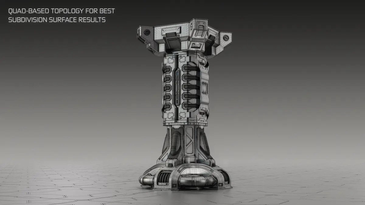 Sci-fi hard-surface machine object with proper quad-based topology for wide spectrum of usage. It might be a hero-object with subdivision modifier or background object without any modifiers. It can be used as a gigantic spaceship or small tool or weapon or part of a bigger futuristic structure.