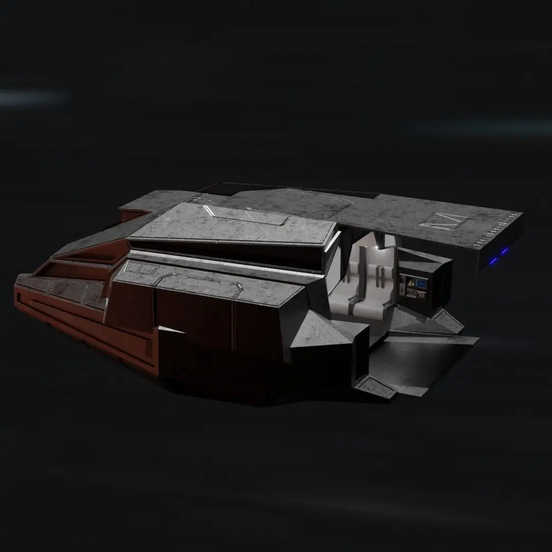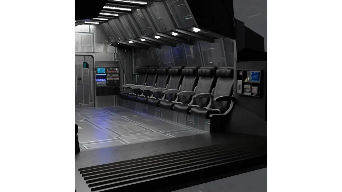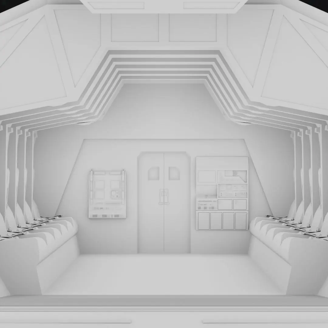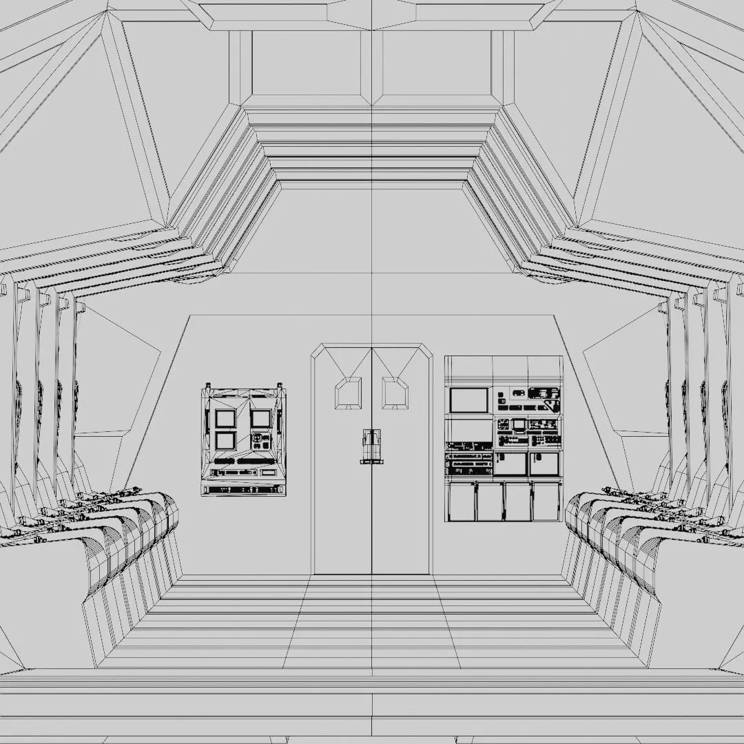 Based on the concept of a futuristic military dropship, the interior is made to accomodate a handful of troops. The individually modeled seats with belts, along with the detailed dial pads on the control panels allow for close up renders.