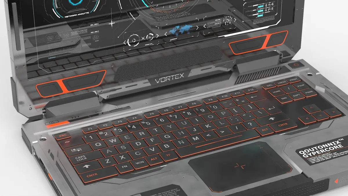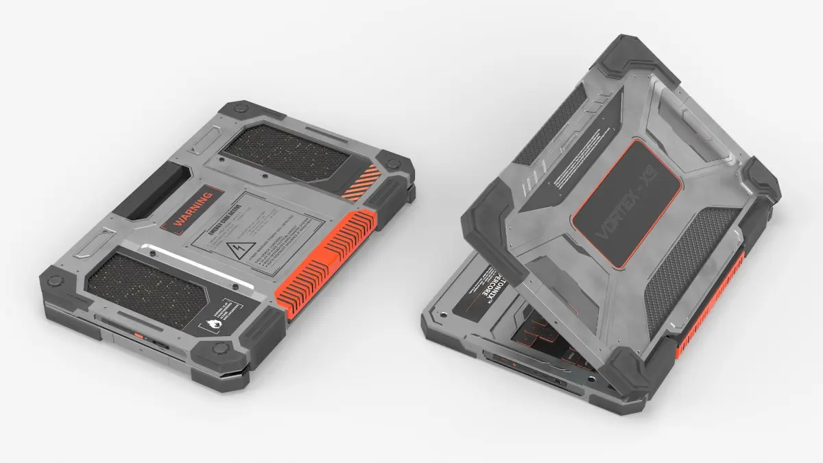 This laptop model features a transparent screen displaying digital interfaces, giving it a cutting-edge look. The rugged build is highlighted by angular lines and sturdy materials, suggesting durability and high performance. With integrated advanced technology elements, it has a sleek and futuristic appeal suitable for tech enthusiasts.