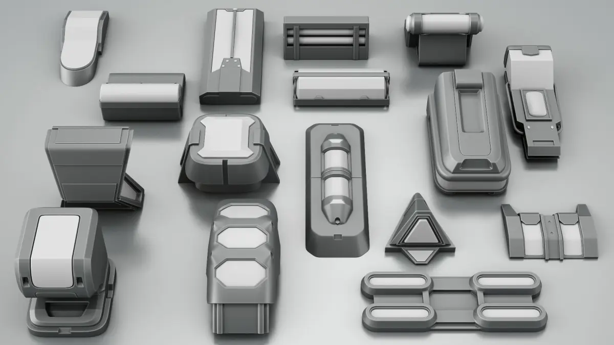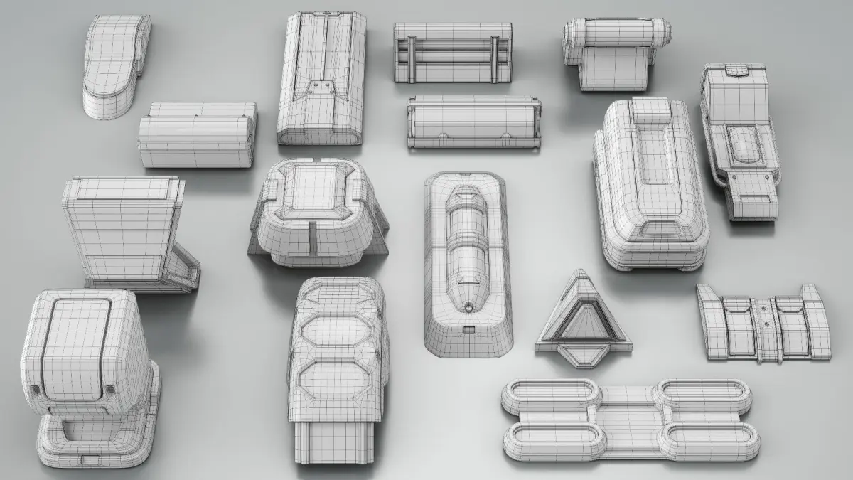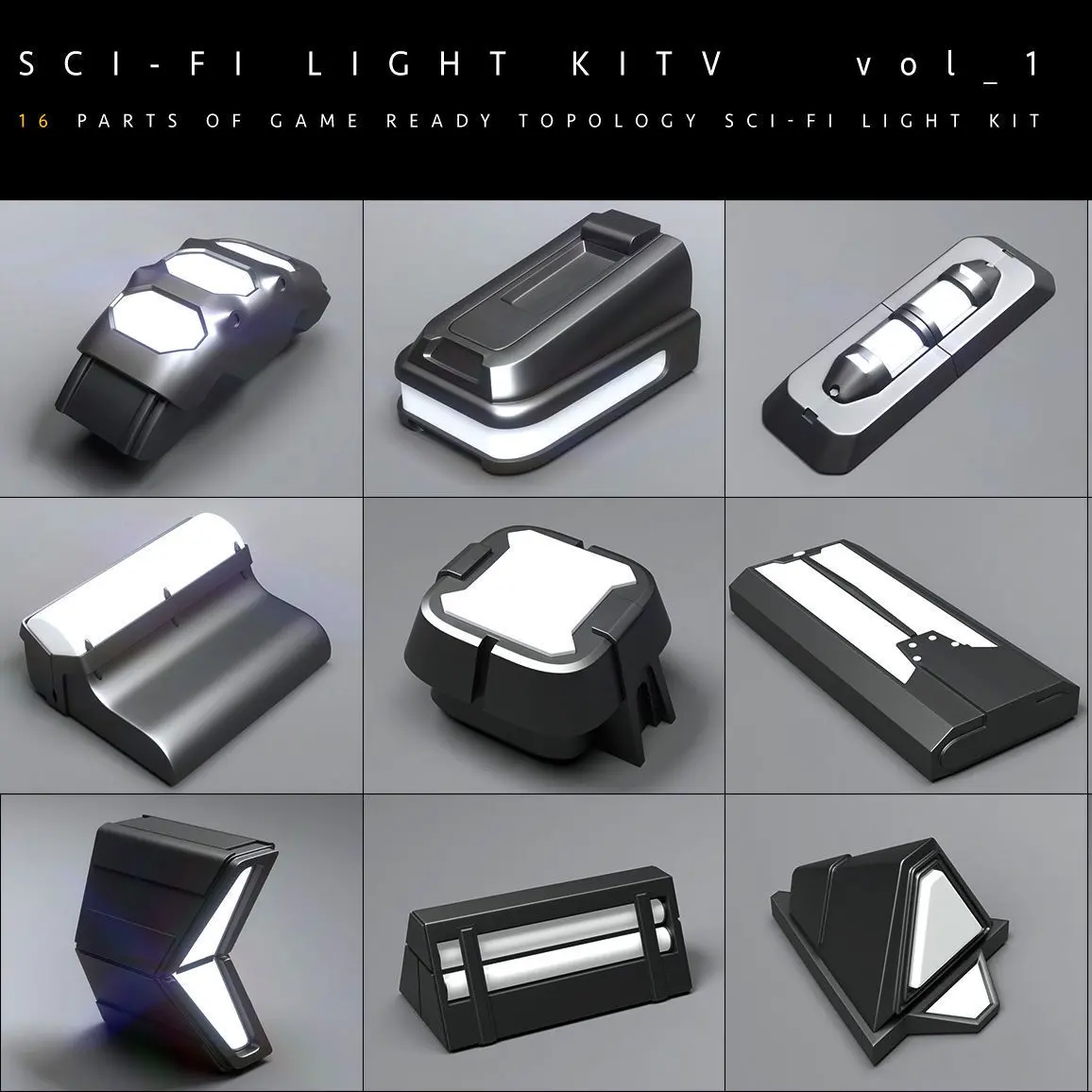 16 Game ready Topology SCI-FI LIGHT KIT [Zbrush IMM brushes ] + 16 Normal maps for Environment Section surface utilization