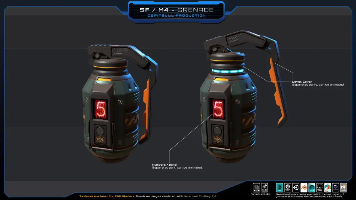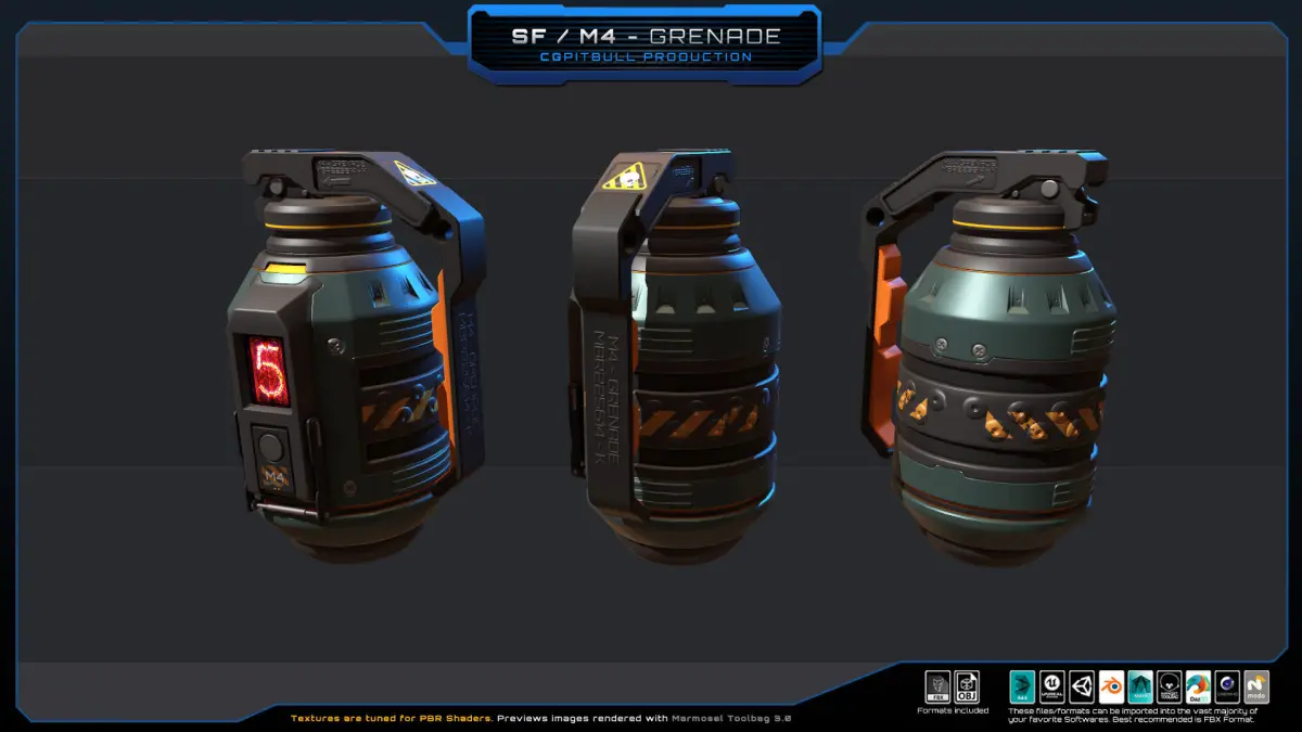 This Original package contains one “Sci Fi M4 - Grenade”. Separated parts, animatable.