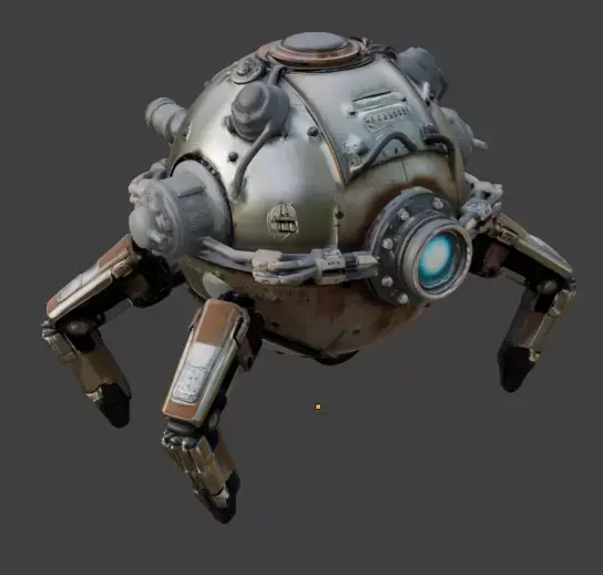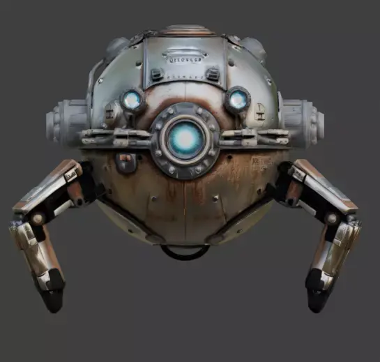 Tags3d model maintenance drone sci-fi robot spherical drone game ready prop industrial utility glowing blue eyes weathered metal realistic rust futuristic machine space station asset repair bot mechanical legs isolated asset pbr materials orbital drone tech prop