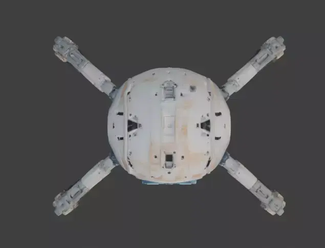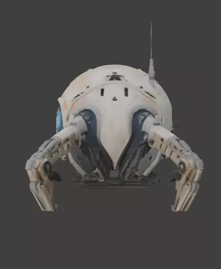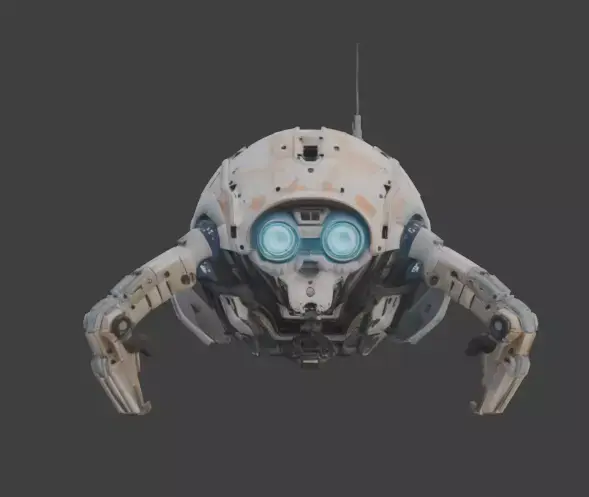 Tags3d model maintenance drone sci-fi robot spherical drone game ready prop industrial utility glowing blue eyes weathered metal realistic rust futuristic machine space station asset repair bot mechanical legs isolated asset pbr materials orbital drone tech prop
