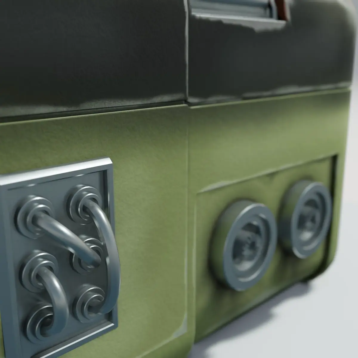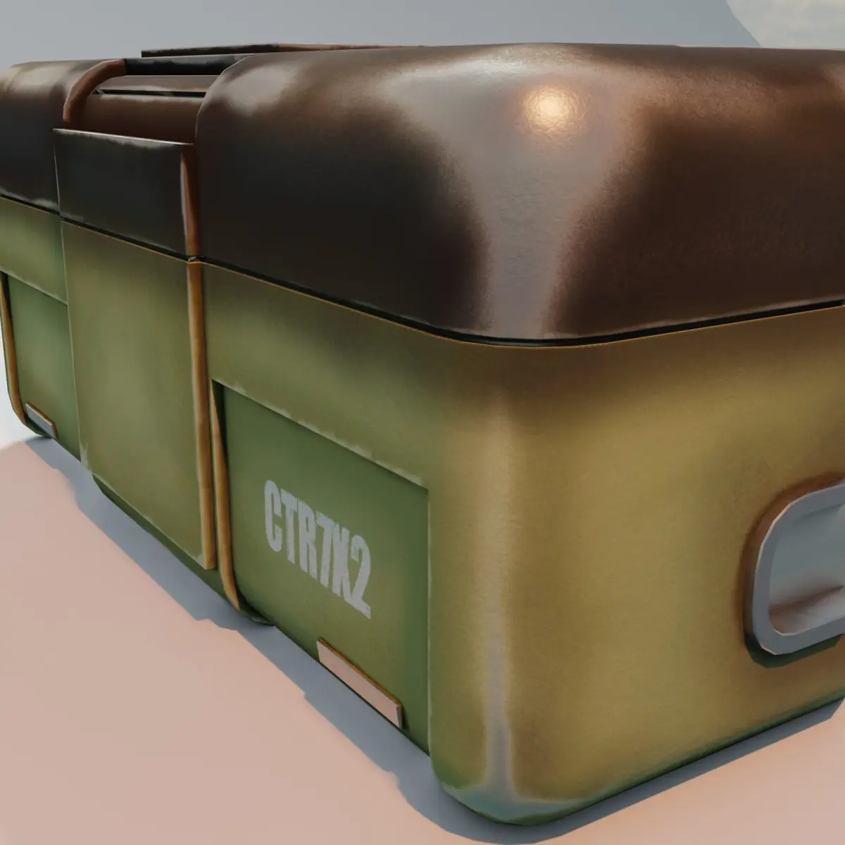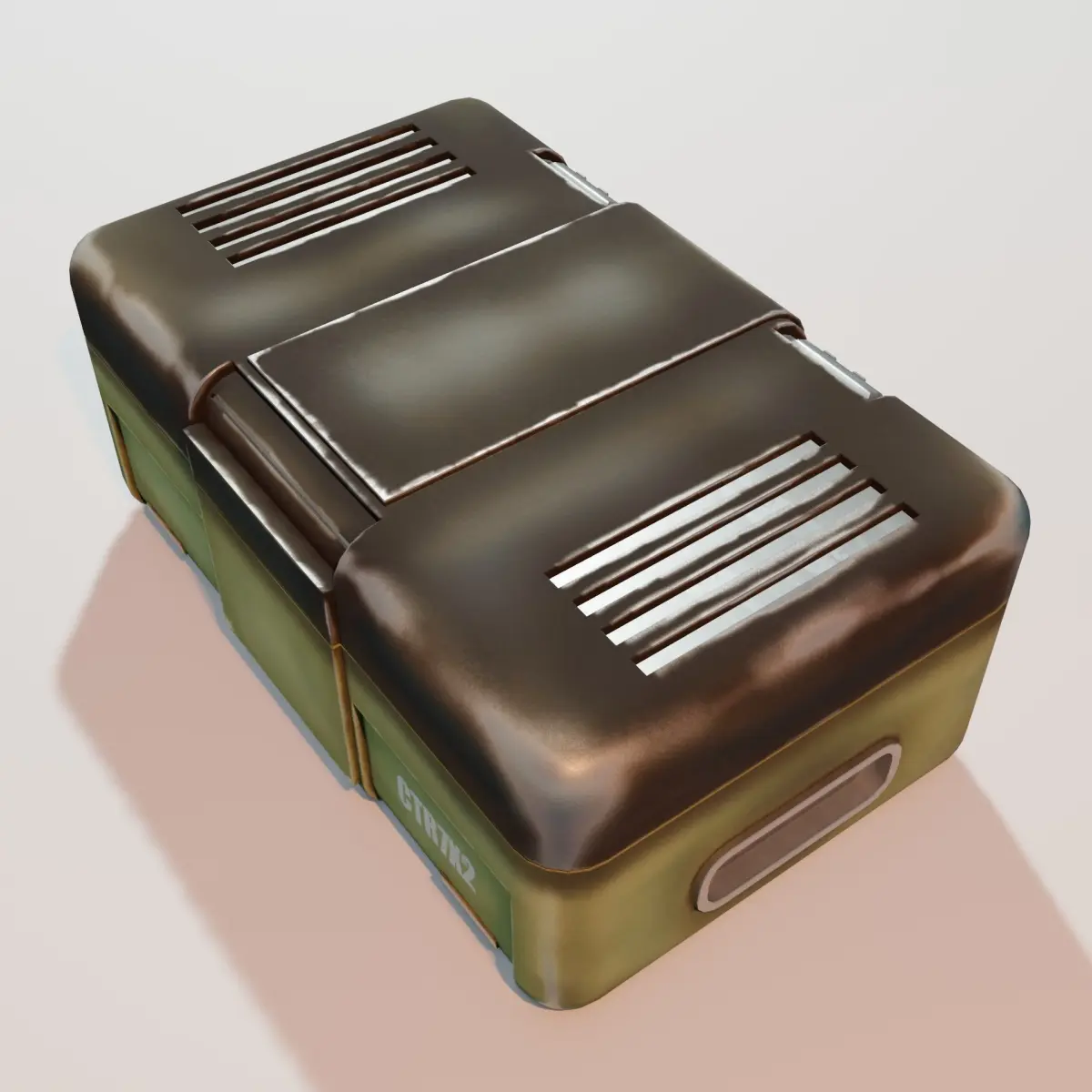 A single high quality, low-poly and game-ready Sci fi military armoured low poly metal box/hard case, painted in green for camoflage.